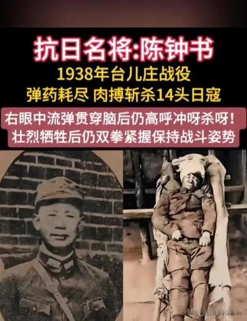 1938年,台儿庄战役47岁的陈钟书将军,在一次肉搏战中挑死14个日军后牺牲,记者拍下了这一幕,被战士们用担架拖回遗体的一张照片。 这张照片背后,是滇军60军千里驰援的热血征程。1937年9月,云南组建60军,4万子弟兵仅用28天完成集结,陈钟书时任183师542旅少将旅长,出发前他将家产全部分给亲友,对妻子斩钉截铁地说:“日本人欺辱我们太甚,身为军人,报效国家的时刻到了,不驱逐日寇绝不回家。” 这支从云南徒步两千多公里的部队,刚抵达台儿庄就陷入绝境——原守军已仓促撤退,15公里防线出现缺口,日军机械化部队趁虚而入,60军尚未构筑工事便被迫接战。 4月22日拂晓,邢家楼、五圣堂一带枪炮声震天,日军在飞机大炮掩护下,以坦克开路向阵地猛扑。陈钟书沉着传令,让将士们隐蔽待命,待日军进入有效射程,一声令下,机枪与手榴弹齐发,日军成片倒下。 可敌人兵力数倍于我方,后续冲锋一波比一波猛烈,战至午后,部队弹药告急,日军骑兵趁机从左翼突袭,阵地眼看就要失守。陈钟书见状,一把抄起上了刺刀的步枪,振臂高呼“打倒日本帝国主义”,率先跃出战壕。 将士们见旅长身先士卒,纷纷紧随其后,与日军展开惨烈肉搏。陈钟书早年毕业于云南陆军讲武堂,戎马半生练就一身硬功,刺刀在他手中运转如飞,接连刺穿14名日军的胸膛。 日军见他勇猛,数人合力围攻,他左挡右刺,身上的军装被鲜血浸透仍毫无惧色。身边的战士倒下一个又一个,他却始终站在阵线最前沿,嘶吼着指挥冲锋,声音嘶哑却充满力量。 偏偏这时,一枚流弹从他右眼射入,后脑穿出,陈钟书踉跄着晃了晃,所有人都以为他会立刻倒下,他却用尽最后力气,再次高喊“冲锋”,才轰然倒地。 战士们红了眼,发疯般击退周围的日军,冒着炮火冲过去护住他。副官急忙组织人轮换背着他撤下火线,可途中将军的气息越来越弱,最终在送往后方的路上停止了呼吸。 记者当时正潜伏在附近阵地记录战况,亲眼目睹了将军牺牲的全过程,含泪按下快门,定格下战士们用担架拖着他遗体撤退的画面。 照片里,陈钟书将军双目圆睁,仿佛仍在怒视敌人,担架旁的战士们脸上满是悲痛,却依旧保持着冲锋的姿态。这张照片后来在部队中流传,成为激励滇军将士的精神力量。 陈钟书的遗体被战士们辗转送上火车,运至徐州东关外的乱岗草草安葬,没有墓碑,只有黄土覆盖着忠魂。他的牺牲没有让部队溃散,反而点燃了所有人的斗志,542旅将士们抱着“为旅长报仇”的信念,在后续的战斗中愈战愈勇,即便阵地得而复失、失而复得,也始终坚守不退。 与陈钟书一同作战的连长赵克,在给父母的家书中写道“已抱定不成功便成仁的决心,去和敌人肉搏”,不久后也在肉搏战中壮烈牺牲。 这场战役中,滇军60军以血肉之躯阻挡日军攻势,为徐州主力部队撤离赢得了宝贵时间。 陈钟书将军用生命践行了出征时的誓言,他的事迹传回云南,家乡百姓为他召开追悼大会,制作“功勋不朽”的匾额悬挂在关圣宫,自发为他立起廉政纪念碑。国民政府追认他为陆军中将,新中国成立后,他被正式追认为革命烈士,英名永远镌刻在历史丰碑上。 在那个山河破碎的年代,像陈钟书这样的先烈,用钢铁般的意志和无畏的牺牲,筑起了民族的脊梁。他们没有先进的装备,没有充足的补给,却凭着一腔爱国热血,在战场上与强敌死拼到底。 那张记录着将军遗体被拖回的照片,不仅是一段惨烈战事的见证,更是中华民族不屈不挠精神的缩影。今天的和平生活,正是无数这样的先烈用生命换来的,他们的壮举不该被遗忘,他们的精神值得永远传承。 各位读者你们怎么看?欢迎在评论区讨论。