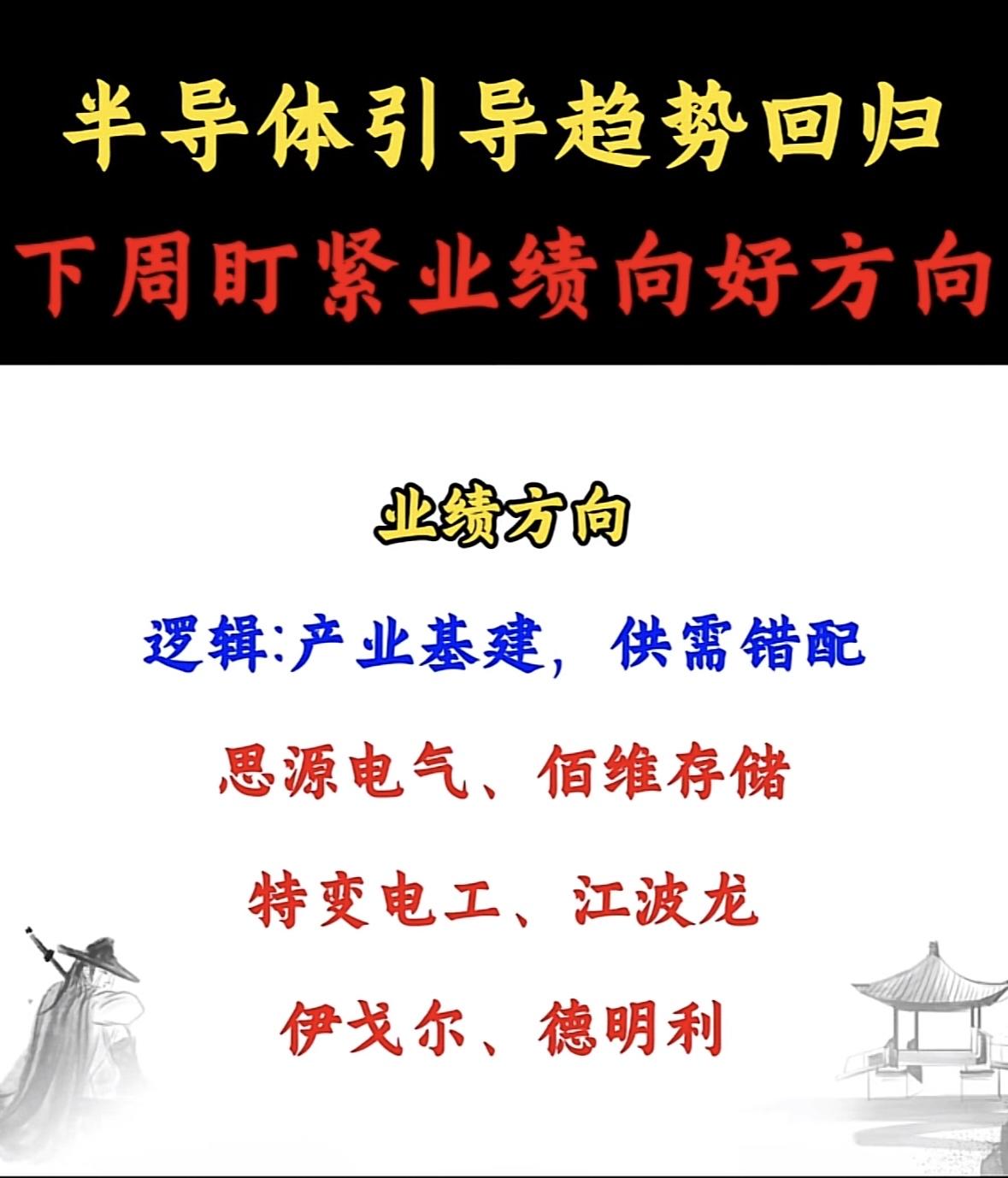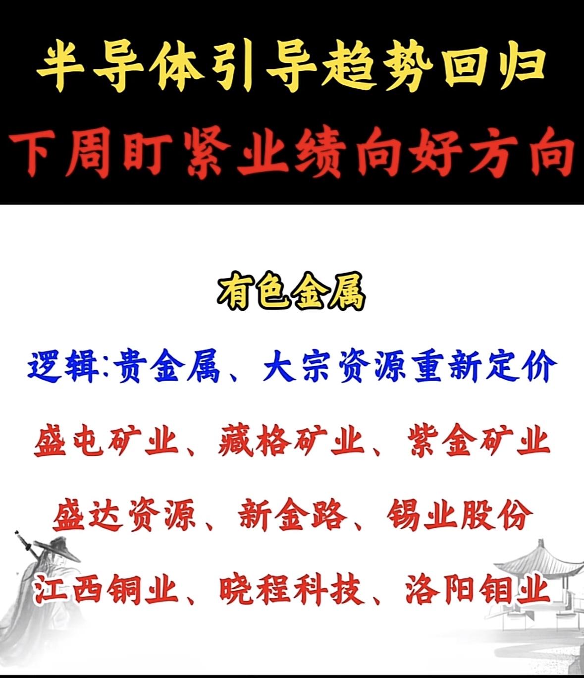 半导体引领趋势,有色金属下周迎涨! 半导体产业趋势向好,关注业绩增长标的。逻辑:基建需求与供需错配驱动。重点企业:思源电气、佰维存储等。