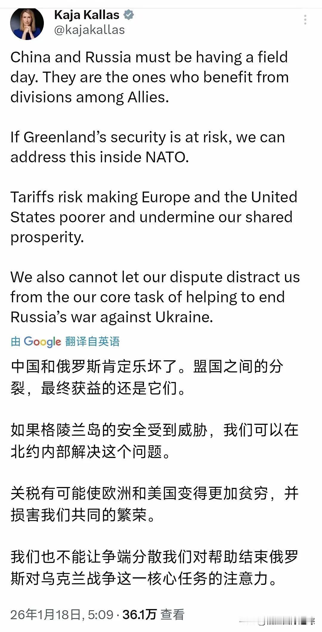 美国要疯了! 1月18日,欧盟高官卡拉斯发话了。她称中俄正“乐见”欧美分裂,强调别让争端影响援乌大局。这话听着不对劲。 真正让欧洲人心寒的,不是远方的对手,而是身边盟友的算计。特朗普一声令下,就要对丹麦、德国、法国等8个北约成员加征关税,理由居然是这些国家不肯配合美国“买下”格陵兰岛。这不是做生意,这是赤裸裸的勒索。 欧洲多国已明确回应:我们不会被胁迫。德国、法国、英国、瑞典纷纷表态,反对以关税解决分歧。欧盟领导人冯德莱恩也警告,这将引发恶性循环,破坏跨大西洋关系。 可卡拉斯却把矛头转向中俄,仿佛问题出在别人身上。现实是,美国正用老套路逼盟友低头,而欧洲必须清醒:真正的安全,不能建立在单方面让步之上。 团结不是嘴上说说,而是面对不公时敢站出来说“不”。欧洲要捍卫的,不只是格陵兰的主权,更是国际规则的底线。靠喝酒解愁不行,靠甩锅更不行,唯有联合自强,才能赢得尊重。