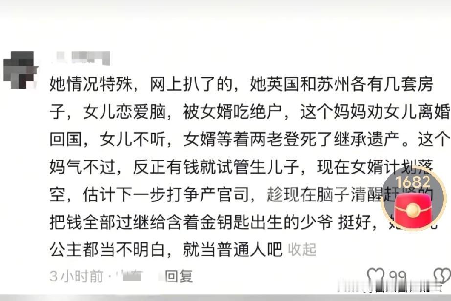 张家港女子59岁生二胎,原来背后的故事这么心酸。女子有个独生女,本来她和丈夫想让女儿留在身边的。 结果女儿是个恋爱脑,结婚后被丈夫带去了英国,就住在女子她家在英国的别墅里。女子家里很有钱,在英国和苏州都有房子。 女儿生二胎前,女婿同意让二胎随母姓。可是二胎生下后女婿又反悔,说是二胎不随他姓,伤害他男人的自尊。 可是话说回来,他住在丈母娘家的别墅里,吃穿都用妻子家的,他就不伤自尊了? 女婿的做法彻底让夫妻俩寒心,他们想让女儿离婚,回家继承家业。可是女儿不听。女子就开始调理身体,自己试管生下二胎儿子。 女婿听说丈母娘生下小舅子后,又同意二胎随母姓,可惜已经晚了。 对于这种情况,网友纷纷支持女子的做法。有人说这个女婿就想吃绝户,明明已经吃软饭了,这点委屈都受不了,就不该让他享福。 有网友称赞这对夫妻的执行力,不哭不闹,冷静想对策。女婿千算万算,没算到丈母娘59岁生子。就像爽文一样。 对于这件事,大家怎么看呢?