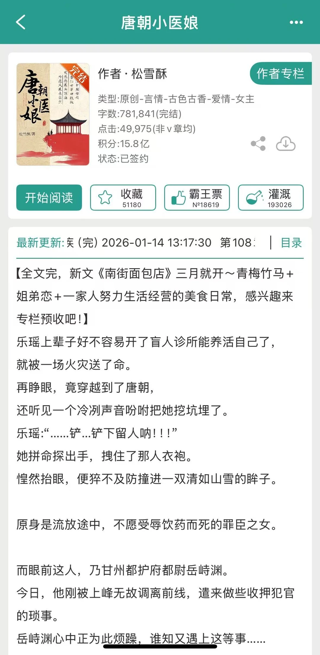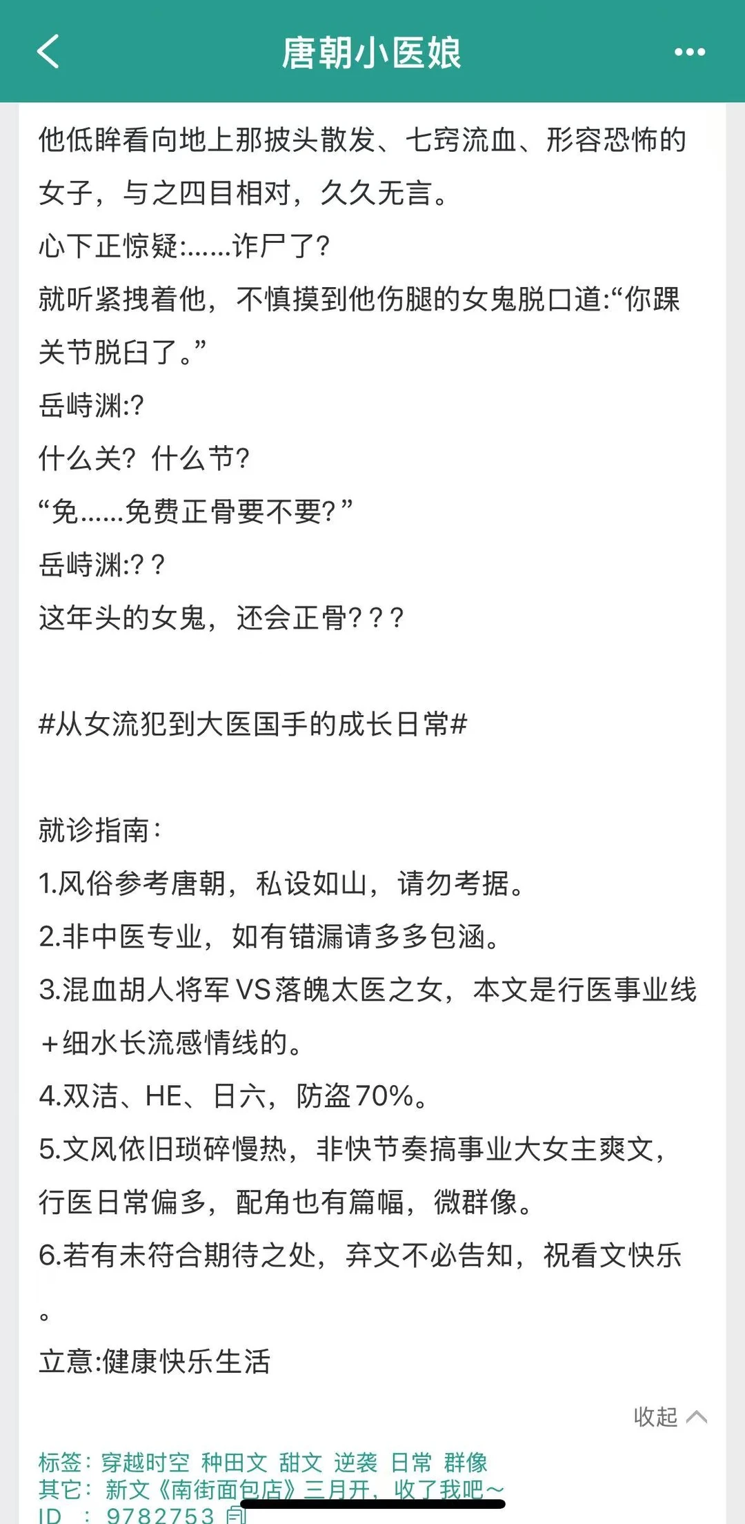 [庆祝R]《唐朝小医娘》,作者:松雪酥 [庆祝R]坚韧聪慧 x 正直有担当 [庆祝R]古言/穿越/种田文/慢热/日常/群像 [种草R]作者大大很擅长写种田文,温暖细腻的文笔,张弛有度的叙事风格,贴近生活和历史的风土人情描摹,细水流长又水到渠成的感情线。 [种草R]作者以女主的行医日常为故事中心,穿插边关军旅生活即风土人情,朝堂权谋旋涡,整个叙事慢热,但情节走向自然,将历史内容融入故事,主打一个治愈,非常值得一读。