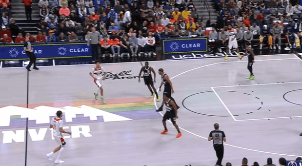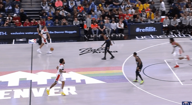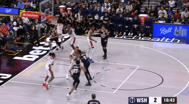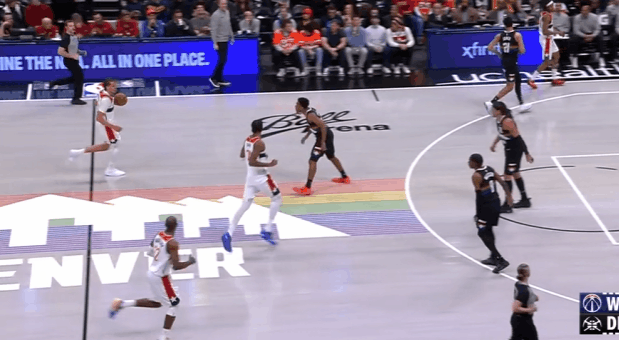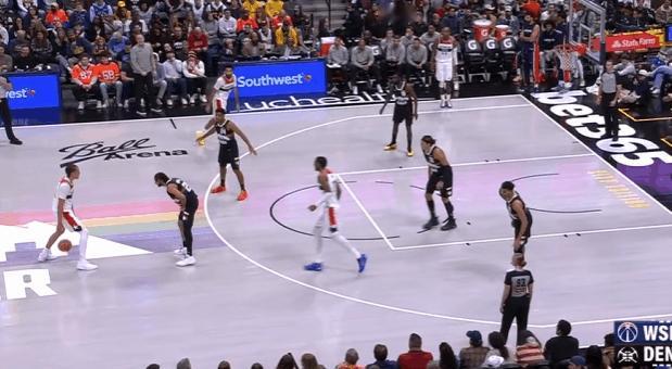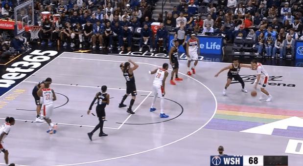 基肖恩-乔治观察:29分3帽全面贡献,操刀挡拆、见缝插针7助攻图1底线球回合1.2秒穆雷空手移动后接球硬解,乔治穷追不舍奋力上前干扰成功帽掉穆雷的投篮。图2乔治持球过半场后立即和萨尔发动“Drag Screen”配合,行进间支肘对抗后立即衔接向右的横撤步中投,稳稳命中。图3乔治、巴格利、尚帕尼三人上线战术小组配合:乔治和巴格利上线发动挡拆,与此同时尚帕尼执行“浅切”(Shallow Cut)。挡拆行进间乔治持球突破抓掘金防守沟通问题,吸引纳吉防守后立即为巴格利送上空接。图4早期进攻阶段莱利假挡后迅速Slip拆走抢出身位优势,乔治立即送上反吊球领人助莱利双手扣篮得手。图5乔治和巴格利发动“Drag Screen”配合被掘金换防破解,面对换防过来并放一步防突放投的纳吉,胯下拉回后坚决出手前脚蹬地炸球撤步三分惩罚。图6掘金2-3联防,奇才这里很有趣的设计是:乔治、尚帕尼强弱侧&有无球同时向篮下行进,最终形成篮下多打少(戈登)的优势局面破解联防。乔治挡拆起手突入篮下吸引戈登防守注意力后,立即找到偷偷空手移动至强侧幽灵区埋伏的尚帕尼,打穿戈登身后。图7弱侧底角接应突至篮下的米德尔顿,接球垫步调整后三分手起刀落。图8双胯下起手衔接挡拆后立即左手大力炸球的同时上步蹬地,完成合球的同时使用撤步,随即出手持球三分。图9转髋加速启动左路突破没能摆脱纳吉被逼停球,随后隐蔽的不看人击地找到空切接应的尚帕尼。图10帽掉穆雷后见布朗接球中路突破直杀篮下,乔治迅速站住护框位置成功制造进攻犯规。图11过半场后立即发动“Drag Screen”面对沃特森换防启动单打,胯下拉回做突右路的假动作,随后再衔接胯下变向启动左路突破,一路碾着沃特森杀入篮下后起跳空中对抗上篮打进。NBA