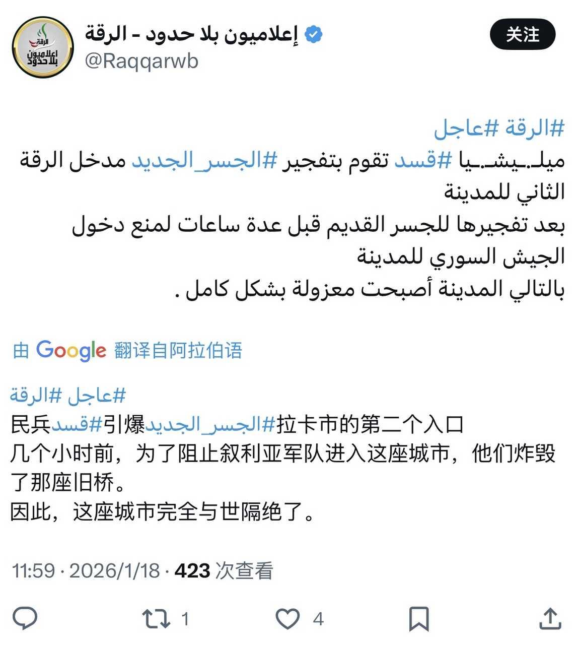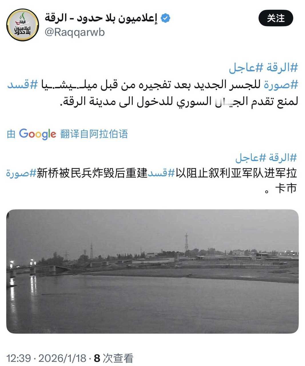 叙利亚拉卡省南部,HTS政权部队从库尔德武装手中夺取了多辆悍马。 在叙利亚拉卡省南部的冲突中,多名被打散的库尔德武装分子向HTS政权军投降。 叙利亚政府军(朱拉尼)取得突破后,SDF目前正从拉卡市撤出。 叙利亚拉卡省南部,数十名库尔德武装分子在塔布卡市被HTS政权部队俘虏。 在拉卡省战事紧张的时刻,叙利亚库尔德武装总司令马兹卢姆·阿卜迪本人还在伊拉克库尔德自治区与伊库领导人马苏德·巴尔扎尼以及美国特使汤姆·巴拉克等人开会。 代尔祖尔省局势(2026年1月17日):部落起义和15分子死灰复燃也蔓延至邻近的代尔祖尔省。在此,hts也派遣了大量部队,并开始支援幼发拉底河对岸的活动,小股部队渡河后向奥马尔油田方向建立桥头堡。 尽管兵败如山倒,但库尔德武装依然抓了一批HTS士兵及响应他们的阿拉伯部落民兵。 叙利亚拉卡省/阿勒颇省前线,昨天库尔德武装使用无人机投掷60毫米迫击炮炮弹阻滞HTS政权部队进攻的一些视频。 由于HTS方面缺少对抗无人机的经验,扎堆的习惯还比较多,在这种投弹袭击中伤亡不小。 昨天下午至晚上,在叙利亚阿勒颇省和拉卡省战死的一些HTS政权恐怖分子。 叙利亚拉卡市,库尔德武装炸毁一座跨河桥梁。 昨天HTS这边发的讣告并不多,满打满算也就15个左右。 进入拉卡的两座桥梁全被SDF给炸了 来自伊德利卜省卡法鲁马镇的两名HTS士兵在拉卡前线被杀,尸体被连夜运回家乡: 奥马尔·穆罕默德·马斯里·谢里夫 阿马尔·阿卡尔·拉迪夫·沙塔赫 叙利亚库尔德武装连夜撤离代尔祖尔市东郊,这里的检查站已经被阿拉伯部落民兵夺取。 叙利亚库尔德武装在塔布卡(可能)使用无人机投弹袭击扎堆的HTS政权军进城部队,总共投了三弹,造成HTS大约14人伤亡(大部分是受伤)。 叙利亚代尔祖尔省东部阿布哈马姆镇,HTS政权派出的一个渡河小队遭到库尔德武装伏击而覆灭,不过看起来损失也不大。 叙利亚库尔德武装似乎已经撤出了代尔祖尔省东部地区,今天上午当地的阿拉伯部落民兵攻占了大量村镇和油气田。不知道当地美军如何反应,估计还是装死。 当地时间昨天上午,也门舍卜瓦省省会阿塔克市的政府军某旅营地内发生骚乱,原因是旅长只给外地士兵发武器,不给舍卜瓦本地士兵发枪。