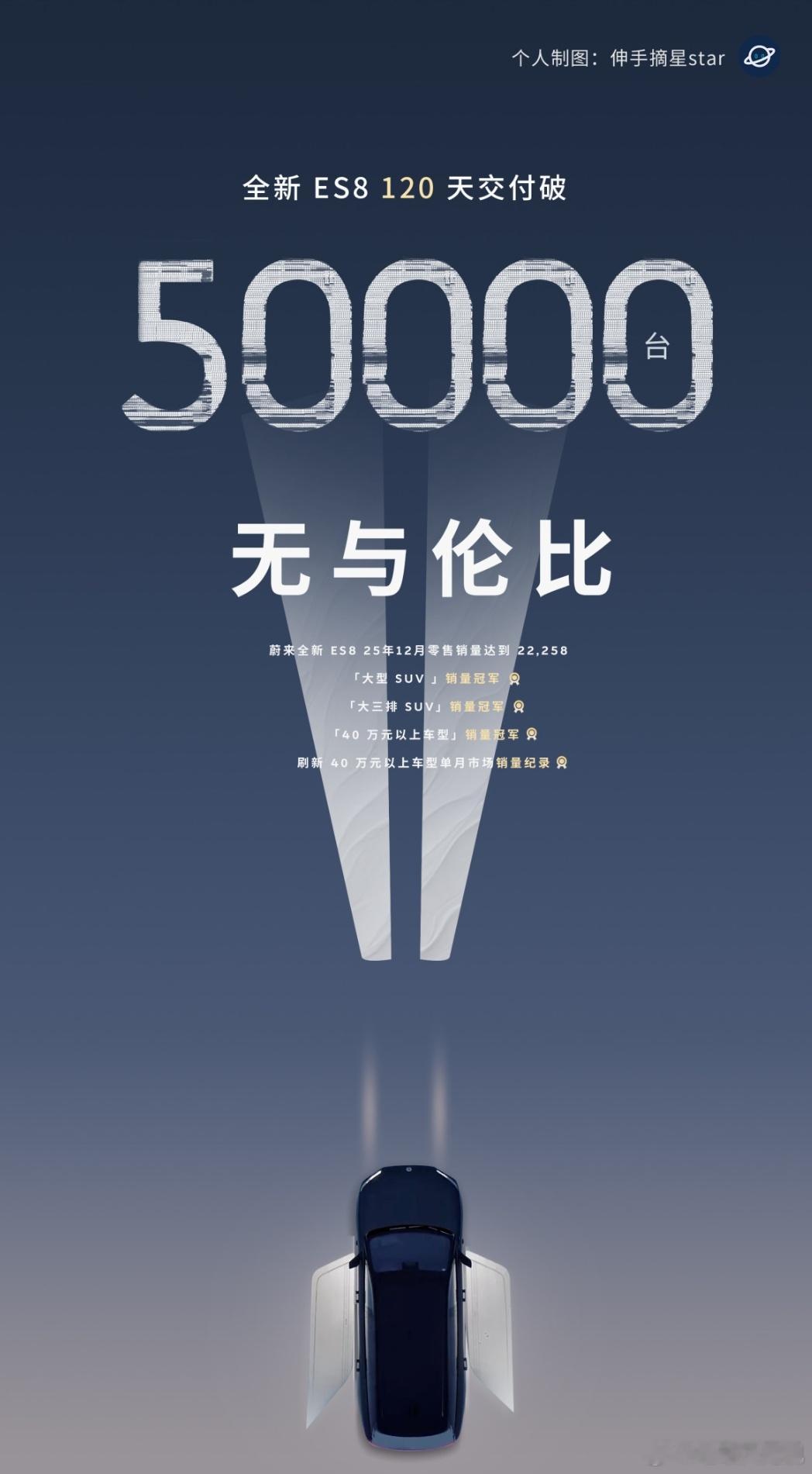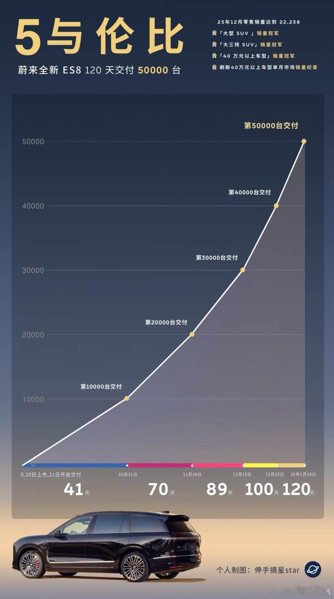 蔚来全新ES8交付120天销量破五万这款车从开始交付到今天所取得的成绩我觉得完全可以用“史诗级”和“现象级”这两个词来形容了纵观整个汽车工业史这个款车也是40万以上最耀眼的那颗明珠如果放在纯电领域我觉得至少五年之内没有友商可以匹敌能超越蔚来全新ES8的估计只有下一代ES8蔚来汽车大局观观点蔚来全新es8