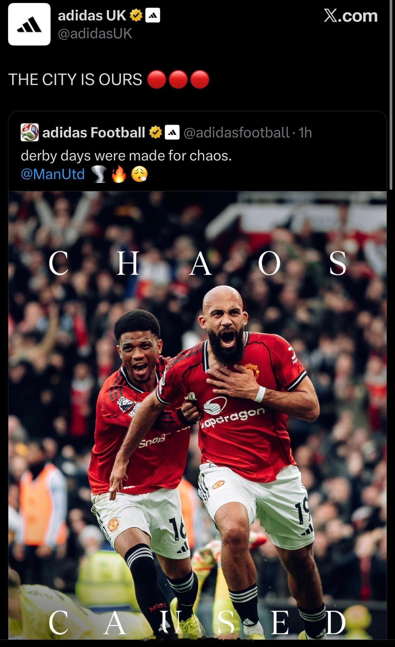 曼联2-0曼城开心的阿迪达斯一语双关:The City is Ours