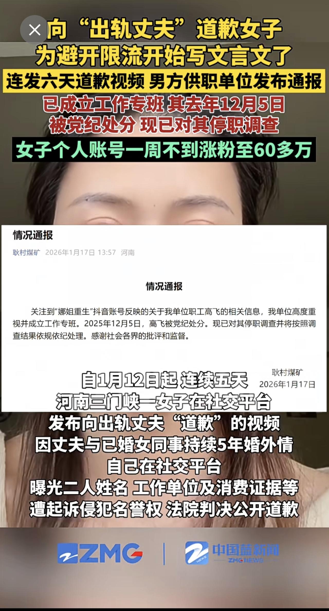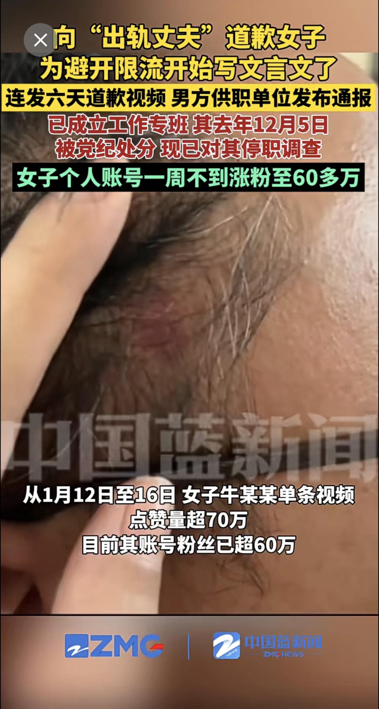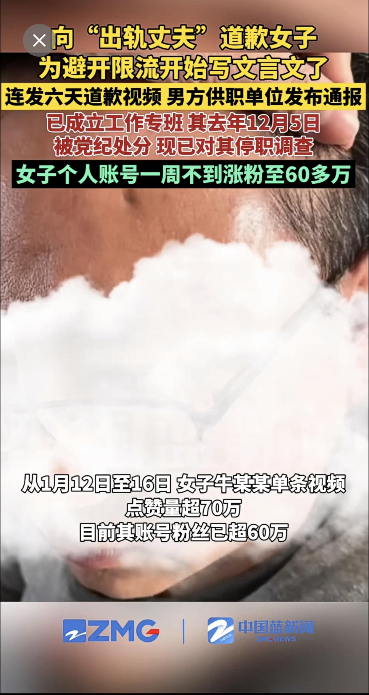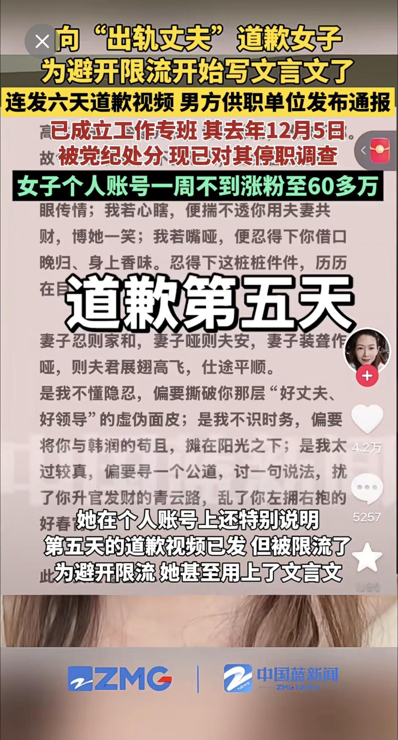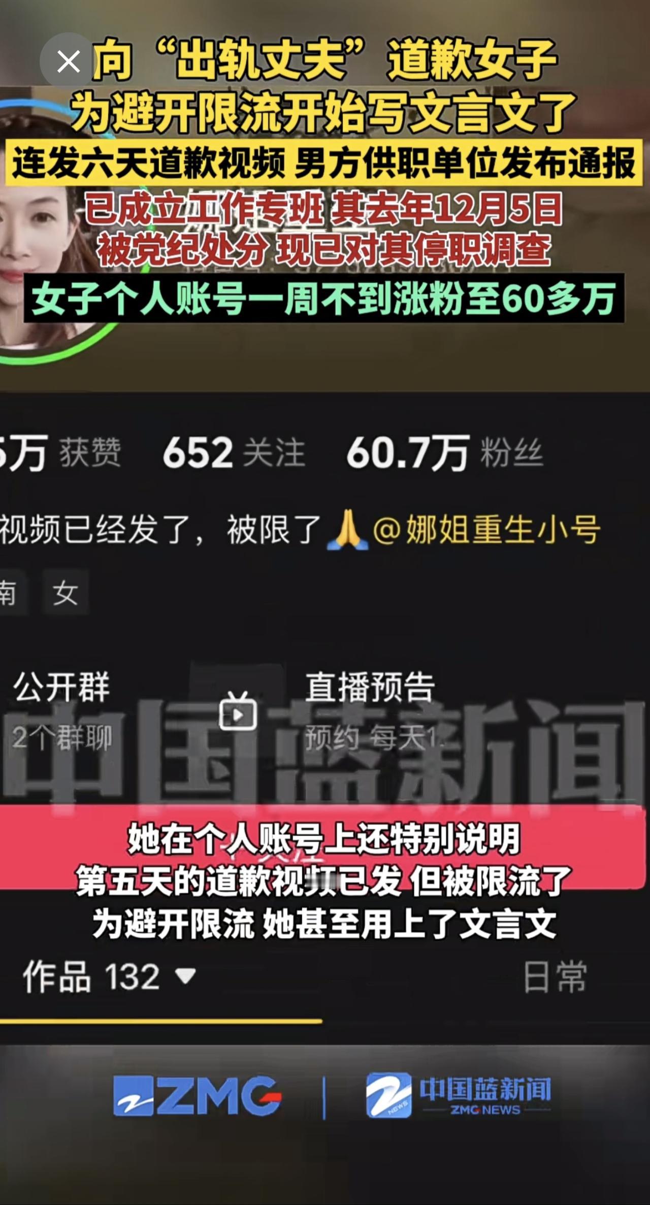向“出轨丈夫”道歉女子为避开限流开始写文言文了,连发6天道歉视频,男方供职单位发布通报:已成立工作专班,其去年12月5日被党纪处分。现已对其停职调查。女子个人账号一周不到涨粉至60多万。