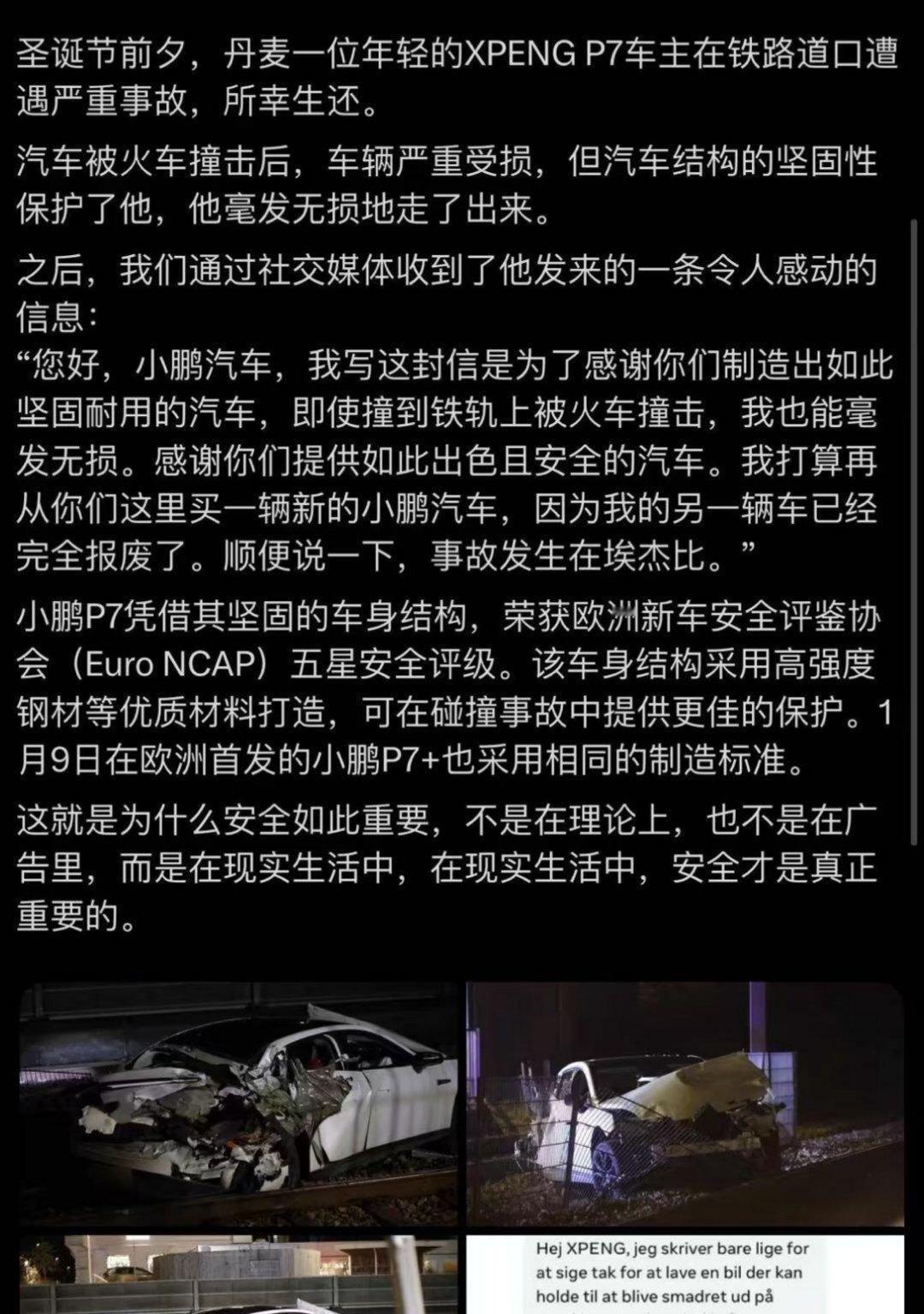 小鹏P7在丹麦被火车撞击,车主死里逃生后发文感谢。涉事车车头车身被严重挤压,部分结构已断裂,车辆已基本报废,但驾驶舱结构仍旧稳定,宝贵的空间让车主死里逃生!中国制造的实力从新能源汽车上也体现出来了!