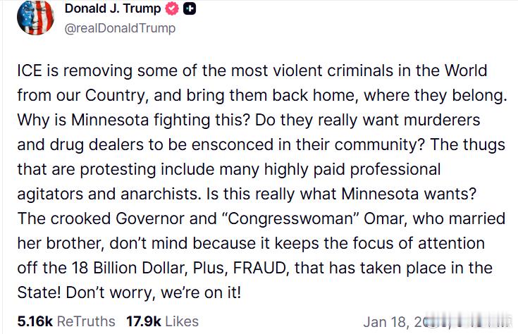 特朗普总统:“ICE 正在把一些世界上最凶残的罪犯从我们国家清除出去,并把他们送回他们该去的地方。为什么明尼苏达州要阻挠这件事?他们真的希望杀人犯和毒贩在自己的社区里安然落脚吗?参与抗议的这些暴徒中,有许多是高薪雇佣的职业煽动者和无政府主义者。这真的是明尼苏达想要的吗?那位腐败的州长以及那名‘国会议员’奥马尔(她曾与自己的兄弟结婚)并不在乎,因为这样可以把公众的注意力从该州发生的高达180多亿美元的巨额欺诈案上转移开来!别担心,我们正在处理这件事!”