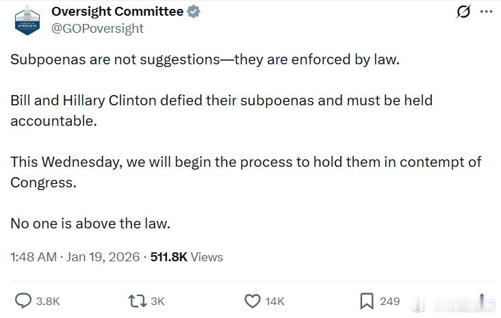 众议院监督委员会:“传票不是建议,而是受法律强制执行的。比尔·克林顿和希拉里·克林顿无视国会传票,必须被追究责任。本周三,我们将启动程序,认定他们藐视国会。没有任何人可以凌驾于法律之上。”
