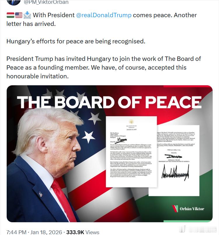 匈牙利总理奥尔班:“特朗普总统已邀请匈牙利作为创始成员,加入‘和平委员会’的工作。我们当然已经接受了这一崇高的邀请。”
