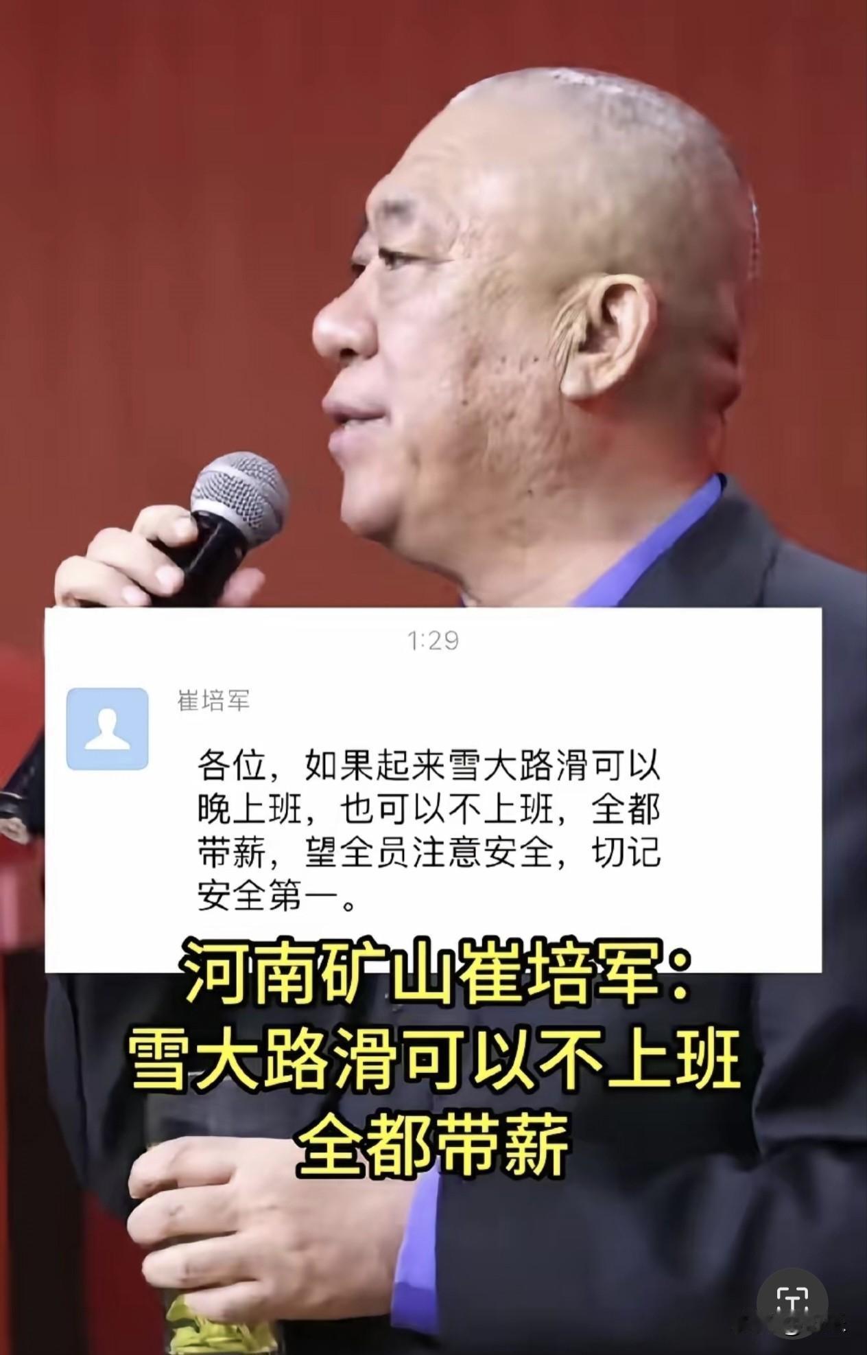 河南明天中雪到大雪,矿山老总崔培军的一条群消息火了! “雪大路滑,员工可晚来、可不上班,全部带薪!安全第一!” 这样的老板真的太少见了!平时常泡车间和工人聊天,说“员工把活干好,公司才能好”;发奖金时嫌一线先进员工奖金少,当场提议董事长翻倍;天气不好,第一个惦记的是大家路上安危。 工人们感动到干活更用心,心里踏实——你把员工当家人,员工自然把公司当家。这样以人为本的领导者,才是企业最珍贵的财富! 河南降雪 暖心企业家