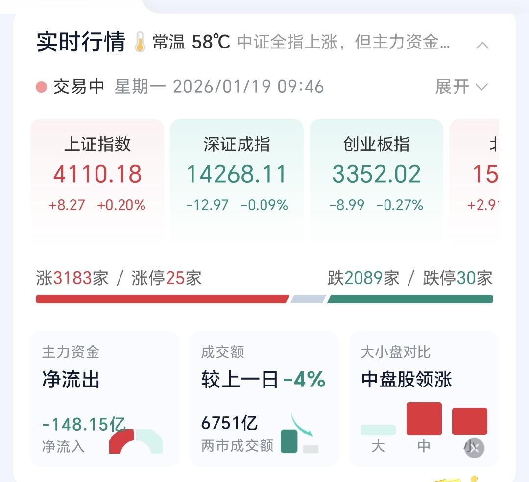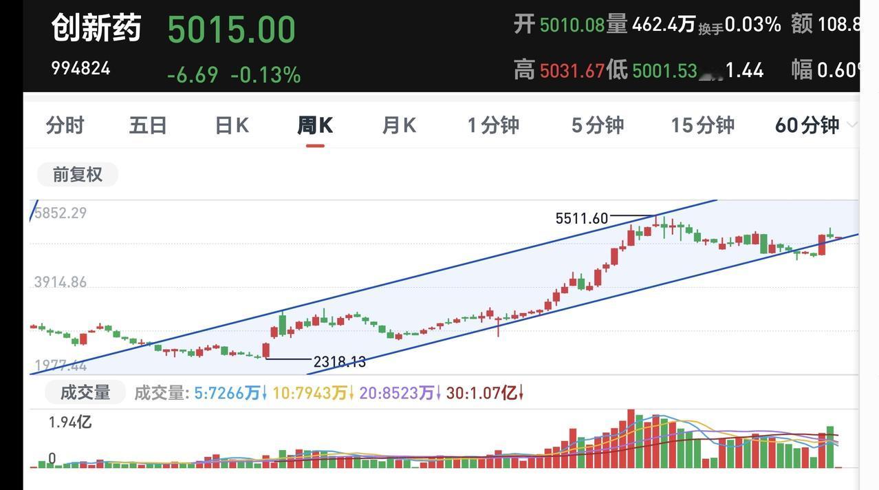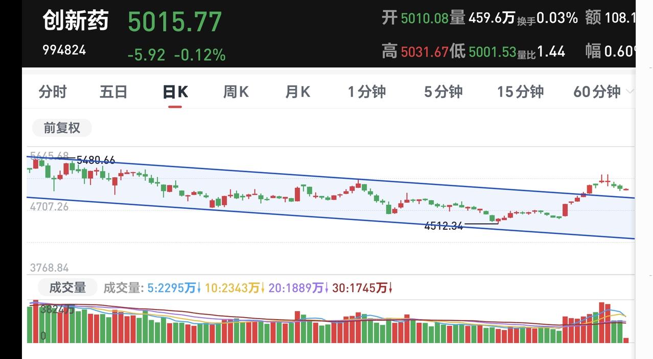 基金:创新药板块今天是什么情况 今天市场低开,三大指数都是低开,创业板指开盘下跌了0.60%,开于3340点,上证指数开盘下跌了0.27%,开于4090点。 开盘以后指数小幅度震荡,上证指数翻红,黄色线在蓝色线上方,但两条线之间的敞口不是很大,黄色线只要能够保持在蓝色线上方,今天大幅度下跌的可能性就不大,黄色线如果能够保持高高在上,今天三大指数全面翻红,也不是没有可能性。 现在盘中五天线位置是4117点,盘中点位4108点,是在五天线之下的震荡,观察能不能站上五天线,只有站在五天线之上,震荡调整才有结束的可能性。 现在两市累计成交6751亿,相比于上周五缩量了5%,成交量萎缩说明资金不愿意进场,成交量萎缩说明今天大幅度上涨的可能性很小。 持有的基金中,估值上涨幅度最大的三个板块是:军工板块,上证50板块,可控核聚变板块,下跌幅度最大的三个板块是:先进制造板块,5G板块,医疗板块,估值整体4620元。 我们来看一下下面的截图8,这是主力资金进出板块的情况,主力资金净流入最多的三个板块是:电网设备板块,一带一路板块,光伏板块,主力资金净流出最多的三个板块是:信息技术板块,电子板块,esg板块。 我们来看一下下面的截图9,今天上涨幅度最大的三个板块是:电网设备板块,交通运输板块,化工板块 我们来看一下下面的截图10,今天下跌幅度最大的三个板块是:创新药板块,恒生科技板块,通信板块。 我们来看一下下面的截图11,这是创新药板块日K线图,从图中可以看出,我画了两条倾斜向下的斜线,这是创新药板块日线级别下跌通道。前段时间上涨突破了这个下跌通道的上轨,现在是在回踩确认过程中。 我们来看一下下面的截图12,这是创新药板块周K线图,从图中可以看出,我画了两条倾斜向上的斜线,这是创新药板块周线级别上涨通道,上上周跌破了这个上涨通道的下轨,上周的上涨又回到了这个上涨通道内,今天是在上涨通道内震荡,近期观察会不会跌破这个上涨通道的下轨。也就是说,观察创新药板块周线级别上涨趋势会不会被改变。 很多人都追求热门板块,认为追求热门板块没有均衡配置更重要,因为,即使你有了热门板块,你不也不一定能够挣钱,热门板块会让很多人亏损,热门板块会让许多人套在高位,同样一只基金,不管是热门板块还是普通板块,都会是有人挣钱,有人亏损,看下面的截图13,同样一件衣服,不一样的人穿,效果是完全不一样的,同样的一件衣服,不是每个人穿都是好看的,这就跟热门板块并不一定每个人都能挣钱,道理是一个样的。 大家帮忙评论,点赞,转发和分享,谢谢大家的支持。 我每天都会分享我的观点,我的观点只代表我个人的看法,不能作为你操作的依据,据此操作后果自负。