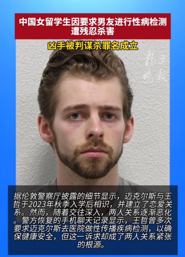 一个31岁的中国女留学生,刚到英国三天,时差都还没倒过来,就和人发生了关系,连基本的防护措施都没做。一周后查出性病,对方轻飘飘一句“just for fun”——就是玩玩而已。姑娘当场就懵了,后来她让那个男的去做检查,换来的不是道歉或解释,而是几刀子。男的被捕后还说自己是自卫,“只是想让她离远一点”。 面对中国女留学生王喆再三提出的性病筛查请求,26岁的美国富家子弟乔舒亚·迈克尔斯,终是按捺不住,耐心消耗殆尽。起初,他仅用一句淡漠的"justforfun"——意思是就是玩玩而已,试图搪塞过去,随后索性提出约见女方来“处理”这一状况。 然而,这一约见绝非为了和解。他两手空空,既无歉意也无体检单,藏在身后的只有利刃。直白点讲,这完全是一次蓄意谋划的杀戮。 时间定格在2024年3月20日晚7点17分,迈克尔斯发出"到了"的讯息后,踏入了王喆位于伦敦刘易舍姆的寓所。仅仅四十分钟后,他便乘车离去。留在他身后的,是倒在血泊中的31岁的王喆——面部身中两刀,颈部因遭受剧烈扼勒而窒息身亡。 更令人义愤填膺、怒不可遏的是,在那之后他所做出的举动,简直突破了人伦底线,着实让人难以容忍。此人在事发后,未即刻呼叫急救或报警,而是优先联系远在美国的父亲,就“如何聘请律师”一事寻求咨询。如此抉择,着实令人大感意外。在蓄意拖延了整整四小时后,直至深夜11点他才报警,且在电话中故作镇定地称"发生了一起严重事件,我已经不在现场了"。 据检察官事后披露,若当时他能及时呼叫救护车,王喆本有30%的生还可能。然而,在那千钧一发之际,他所做出的抉择,实乃无奈之举,唯有选择自保之路,以图在困境中寻得一线生机。 乍看之下,悲剧源于一场关于“染病”的误判——王喆因皮肤出现红点而恐慌,误以为感染性病,遂急切催促男方检测。然而事实证明,男方身体健康,那些红点或许不过是寻常的过敏反应。 王喆后续提出的检测要求,本是基于健康负责的基本诉求。然而在对方看来,这却构成了"纠缠"与"找麻烦"。一方视之为尊重,另一方视之为羞辱,认知的错位让矛盾如滚雪球般失控。 最终那晚,王喆将约谈地点选在了自家公寓——这个私密且无旁人的空间,在她看来是最具安全感的"主场"。殊不知,这反而为对方行凶提供了绝佳的契机。 庭审现场,迈克尔斯言辞急切地极力辩解。他声称:“她手持利刃向我冲来,我不过是出于自卫本能,仅仅是想让她与我保持安全距离罢了。”这番言辞看似理直气壮、言之凿凿,仿佛无懈可击。然而,警方不仅在其住所搜出了沾染王喆血迹的衣物,还通过技术手段复原了他刻意删除的通讯记录。尸检报告更是致命一击:头部遭受两处致命刺伤,颈部留有清晰的压迫窒息痕迹,加之面部遍布的防御性伤口——这绝非所谓的"自卫",而是赤裸裸的预谋杀伤。 陪审团审慎审视了全部证据,历经16个半小时的激烈研讨,最终作出裁定:被告谋杀罪名成立。伦敦警方亦给出定性:此人乃极度危险的暴力分子。 整起案件最为荒谬讽刺之处何在? 王喆或许根本未曾染病,红点大概率仅是皮肤过敏。谁能料到,那悲剧的熊熊烈火,其导火索竟只是一场令人啼笑皆非的乌龙。这看似荒诞的开端,却无情地拉开了悲剧的沉重帷幕。但这乌龙何以致死?根源在于更深层的症结——权力的失衡、沟通的崩塌,以及那种将他人视为玩物的冷酷。 一位初入异国、语言文化生疏且急需情感寄托的女孩,遭遇了一位家境优渥、游刃有余却对感情毫不在意的"猎手"。这段关系,自萌芽伊始,便已深陷畸形之渊。如同被命运的丝线错织,从最初就偏离了正常轨迹,注定难以有圆满的结局。 当她终于察觉异样,试图维护自身权益时,得到的并非尊重,而是厌恶,甚至是被暴力抹除。"让她离远一点",意味着在物理层面上让她彻底消失。 2025年12月8日,这一天,判决的帷幕终得落下,喧嚣归于平静,一切似尘埃落定,于时光长河里留下了不可磨灭的印记。校方宣布,王喆生前筹备的作品将被收录进选集出版。然而这份迟到的纪念,却让人心头沉重,毫无慰藉之感。 这位被导师誉为温柔优秀、对写作满怀热忱的姑娘,本应拥有无限的未来去追逐梦想,生命却永远停滞在了31岁。 朋友们,这起案件宛如一记振聋发聩的警钟,为每一位留学生敲响。它以不容小觑之势,提醒着大家在海外的求学之路上务必提高警惕,审慎行事。海外之凶险,绝非仅藏匿于暗夜街头,于那看似亲昵无间的关系罅隙里,它亦悄然蛰伏,伺机而动,令人防不胜防。那些打着"文化交流"旗号的试探,那些因新鲜感而冲昏的头脑,以及那句轻飘飘的"justforfun",都可能是致命的陷阱。 识人需在谈情先,遇事冷静重沟通,一旦察觉险情应立即求助而非独自死扛。世间没有任何一段关系,值得以生命为赌注。 信息来源:扬子晚报|《中国女留学生因要求男友进行性病检测遭残忍杀害,凶手被判谋杀罪名成立》