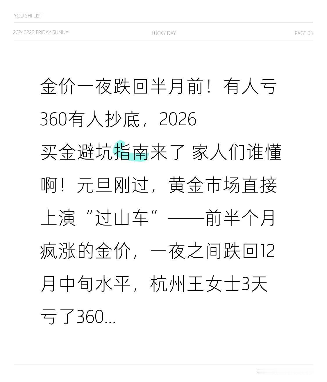 金价一夜跌回半月前!有人亏360有人抄底,2026买金避坑指南来了 家人们谁懂啊!元旦刚过,黄金市场直接上演“过山车”——前半个月疯涨的金价,一夜之间跌回12月中旬水平,杭州王女士3天亏了360,北京李先生却连夜抄底,这波操作到底谁对谁错? 2025年全年金价疯涨70%,伦敦金冲上4550美元/盎司,“黄金血脉觉醒”成了年度热词,890万年轻人跟风定投黄金ETF,连央行都连续13个月增持。身边不少人喊着“乱世买黄金”,年底金店挤得比菜市场还热闹,销售一句“还会涨”,就让无数人咬牙下单。可谁能想到,美东时间12月31日,纽约期金突然跌超1%,国内周大福、老凤祥连夜调价,每克直降5-10元,刚买的金镯子瞬间“缩水”。 这还不是最坑的!很多人跟风买一口价黄金,5000块的项链实际才3克多,折算下来每克1600元,回收时却只给800一克;还有人被“金镶玉”忽悠,0.5克黄金配廉价玉髓卖3000,黄金实际价值才400块。更扎心的是,90%的人不知道,四个九、五个九的黄金,回收时和三个九足金一个价,多花的钱全打了水漂。 但转折点来了!真正会买金的人,早就掌握了“新三金”逻辑:货币基金管日常、债基稳收益、黄金基金抗风险,2100万年轻人靠这招实现稳健增值。买金饰记住三个原则:只买按克计价的,工费超过60元直接砍,避开镶嵌款和镂空款;钢印必须有AU999或足金999,没有的大概率是假的;买前先查实时金价,大胆要员工折扣,能省几百是几百。 其实咱们普通人买金,图的不是暴富,而是一份安全感。金价涨涨跌跌很正常,跟风追高不可取,盲目抄底也危险。就像那位95后定投者说的:“分散配置才稳,赚得少点但亏得也少”。黄金是资产的“压舱石”,不是短期炒作的工具,选对方式才能让它真正为我们兜底。 你2025年买黄金赚了还是亏了?有没有踩过一口价的坑?评论区聊聊你的经历,转发给想囤金的家人,一起避开套路不花冤枉钱!