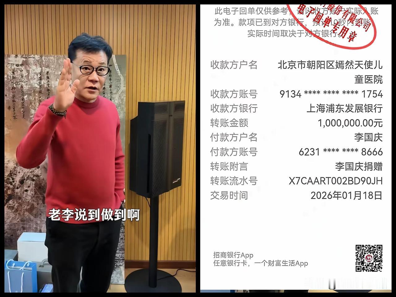 李国庆真金白银给嫣然儿童医院捐了100万!实打实的个人税后钱,不是公司账,转账凭证明明白白晒出来了。 李亚鹏特意发微信小心问这笔钱的指定用途,怕自己这边出一点纰漏,李国庆直接豪爽回:完全信任你,医院缺啥就补啥,你看着办就好。 谁能想到俩人因公益结缘,一个大方托底,一个谨慎守责,这100万正好解了嫣然的燃眉之急,能帮到更多患病孩子。要知道嫣然这段时间本就难处不少,李亚鹏更是扛着压力守着这家医院,这份坚持从来都看在眼里。 做慈善从不是嘴上说说,李国庆这波真性情太圈粉,李亚鹏守着初心扛事也值得敬佩。善意不分大小,真金白银的帮扶,暖的是孩子的心,更是公益路上的这份底气!