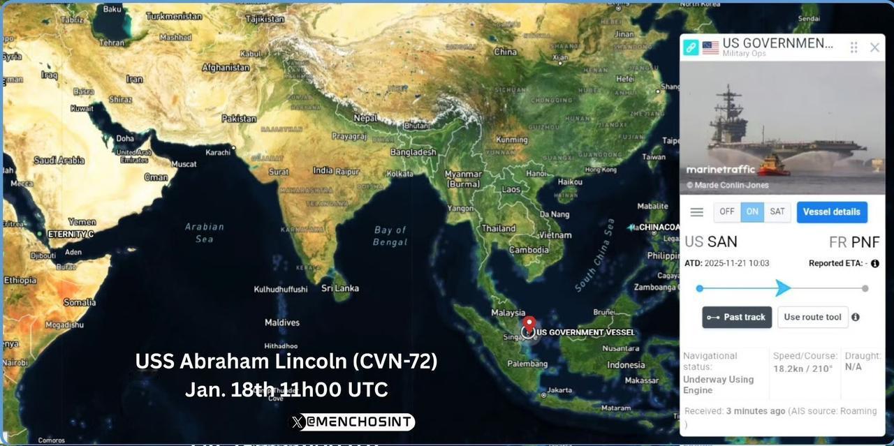 🔻林肯号航母打击群跑挺快,已经抵达马六甲海峡了。