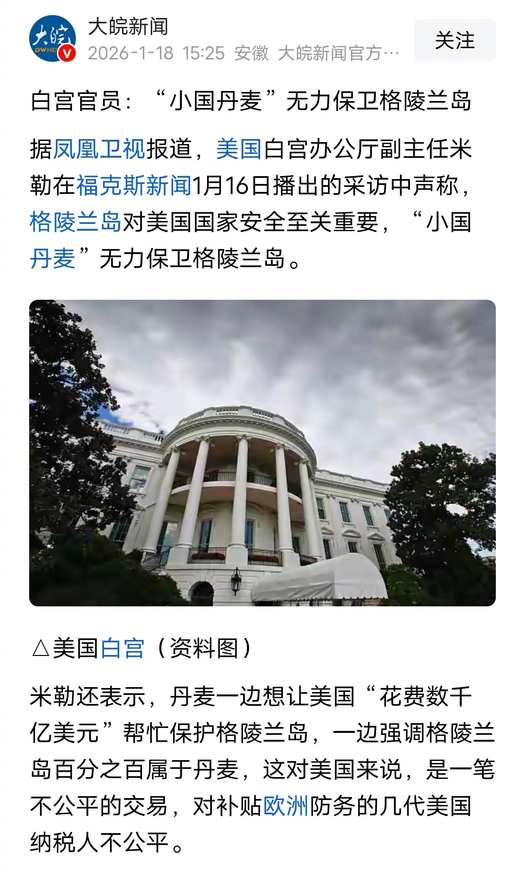 美国白宫官员表示,小国丹麦无力保卫格陵兰岛。现在只有龙应台可以救丹麦,可以救格陵兰岛,丹麦应该花钱让龙应台去说服特朗普,不要大国保护,只要小国尊严。