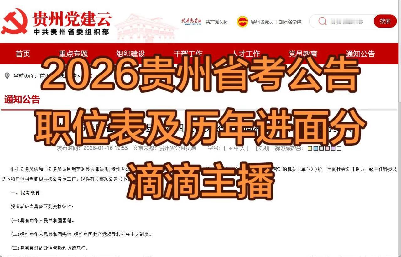 2026贵州省考公告已出。2026年度贵州省省、市、县、乡四级机关统一面向社会公开招录公务员公告报名时间:1月19日-23日笔试时间及科目:3月14日《行政职业能力测验》、《申论》3月15日 专业科目贵州省考