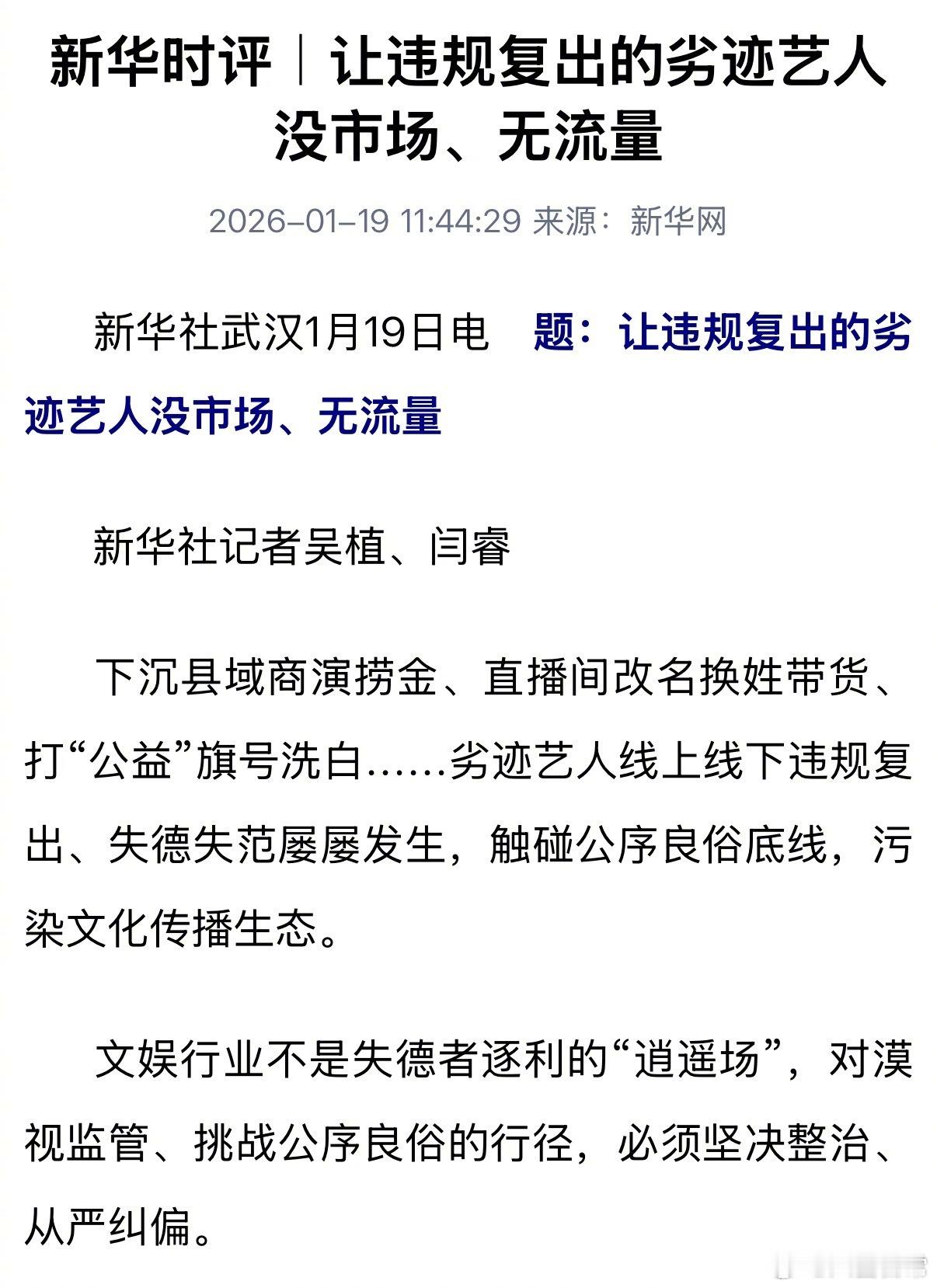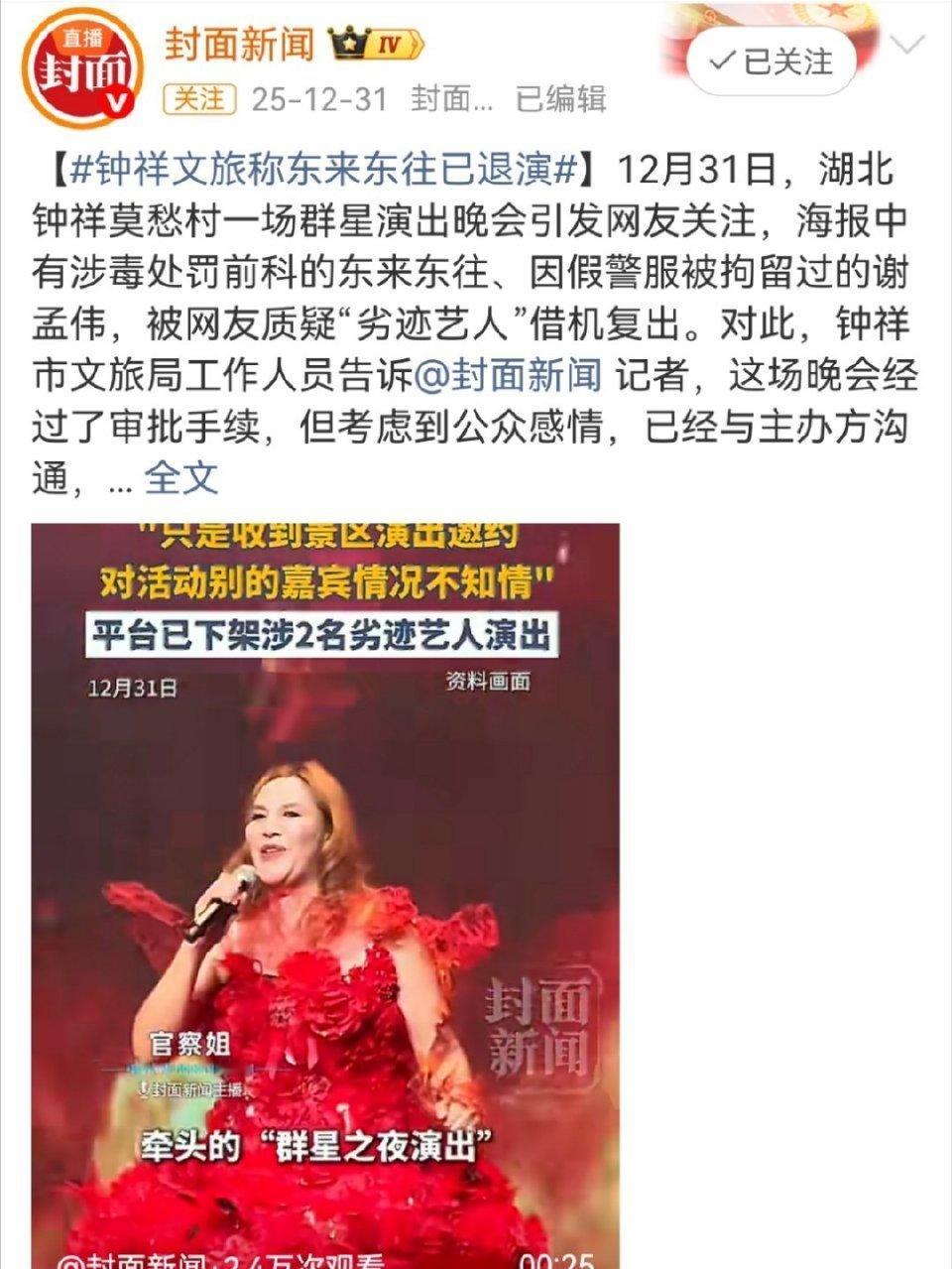劣迹艺人打信息差到县域商演捞金 新华时评说的这个应该就是东来东往打信息差到县城商演捞金,后来被叫停了。这个演出还是那艺娜主打的,里面还有穿警服带货被拘留的谢孟伟。整个演出已经下架了,本来应该1月10日举办,现在也没举办