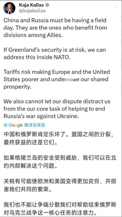 1月18号,就在特朗普宣布,对欧洲八国的关税之后,欧盟外交政策的最高代表卡拉斯发文,暗讽“今天中国和俄罗斯肯定高兴坏了”。其见识之浅薄,让下面大部分的欧洲网友,都看不下去了。这似乎再次印证了,前不久德国前总理默克尔的那句话——欧洲的外交政策,已经被东欧和波罗的海三国,所“绑架”了。 默克尔三年前的警告,正在应验。2025年,她在采访中直言:“波兰和波罗的海国家的反对,让欧盟失去了与俄罗斯对话的最后机会。” 这种“绑架”逻辑,在格陵兰岛危机中再次上演。 当丹麦、挪威等北欧国家因地缘紧密,对美国购岛提议本能抗拒时,波罗的海三国的反应,却异常激烈。爱沙尼亚外长公开宣称,“这是对所有北约国家的羞辱”,波兰更是第一个跳出来,支持欧盟启动“反胁迫工具”。 这种反应,源于小国根深蒂固的安全恐惧:历史上被大国瓜分的记忆,让它们本能地将“紧跟美国”视为生存法则。 这种小国主导的外交,导致欧洲陷入战略短视。以格陵兰岛为例,该岛对欧洲的实际经济价值,微乎其微(2023年欧盟对格陵兰贸易额仅12亿欧元),但波罗的海三国却将其渲染为,“北约北线生死战”。 结果,当特朗普的关税大棒落下,欧洲的反制措施反而充满妥协:原计划930亿欧元的报复清单,被压缩到“观望至2月1日”;本可动用的“经济核武器”反胁迫工具,最终变成了“给特朗普下台阶”的谈判筹码。 小国的安全焦虑,正在透支欧洲的战略自主性。 卡拉斯的甩锅言论,暴露的是欧洲更深层的经济脆弱性。2023年数据显示,欧盟对美出口占其总出口的19.7%,仅德国汽车产业就有23%的产能依赖美国市场。 这种依赖,让欧洲在关税战中底气不足。当特朗普威胁对欧洲汽车加征25%关税时,德国工业联合会测算,仅大众集团一家就可能损失47亿欧元——这相当于汉堡港半年的集装箱吞吐量。 更致命的,是能源与供应链的“双重依赖”。欧洲63%的武器采购来自美国,58%的液化天然气进口依赖美国页岩气。 这种结构性依附,让欧洲在反击时投鼠忌器。正如荷兰外交大臣范韦尔所言:“我们不是怕打贸易战,而是怕贸易战背后的军事连锁反应。” 当美国一边挥舞关税大棒,一边要求欧洲增加北约军费至GDP的5%时,这种“经济-安全”捆绑,让欧洲连说“不”的勇气都被消解。 卡拉斯的言论,还撕开了欧洲“双重标准”的遮羞布。面对美国赤裸裸的领土威胁(购岛提议被国际法专家称为“殖民主义复辟”),欧盟的反应是“反对但保留对话”;而面对中国企业正常投资,却祭出“强制剥离”的行政手段。 这种反差,在欧洲网友眼中尤为刺眼:“美国抢岛是‘盟友分歧’,中国修路是‘威胁安全’,这就是你们的价值观?” 这种双标,本质是战略投机的失败。欧洲试图在中美之间“骑墙”,却高估了美国的容忍度。 2025年德国基尔研究所的报告显示,特朗普的关税政策已让欧洲损失1200亿欧元,远超对华贸易摩擦的损失。 更讽刺的是,当欧洲跟着美国对华加征电动汽车关税时,美国转头就对欧洲钢铁加税——所谓的“跨大西洋团结”,不过是美国单边主义的遮羞布。 回到格陵兰岛危机的原点,欧洲的困境早已写在默克尔的警告里。2021年,她试图建立的欧盟-俄罗斯对话机制,因东欧国家反对而流产。 如今,同样的剧本在中美欧三边重演:波罗的海三国坚持“对华脱钩”,南欧国家呼吁“务实合作”,北欧国家则在安全与经济间摇摆。这种撕裂,让欧盟的“战略自主”沦为口号。 数据最能说明问题:2023年,中欧贸易额达8200亿欧元,是欧美贸易额的1.6倍;中国对欧投资连续五年增长,创造了120万个本地就业。但在东欧国家主导的舆论场中,这些数字被简化为“中国威胁”。 当卡拉斯之流忙着“找外部替罪羊”时,德国工业联合会的警告显得尤为刺耳:“继续追随美国的保护主义,欧洲将失去全球15%的市场份额。” 格陵兰岛的关税战,不过是欧洲战略困境的一个缩影。当东欧和波罗的海三国将历史创伤转化为外交杠杆,当经济依赖消磨了反抗的勇气,欧洲正在沦为“大国博弈的提线木偶”。 卡拉斯的言论之所以可笑,是因为她看不见一个简单的事实:真正让中俄“高兴”的,不是欧洲的分裂,而是欧洲自己放弃了成为“第三极”的可能。 默克尔时代的务实外交虽不完美,至少让欧洲保有尊严;而如今被小国绑架的激进路线,正在让欧洲失去最后的战略清醒。 或许,欧洲需要明白:真正的自主,始于对自身利益的诚实,而非对小国情绪的妥协。