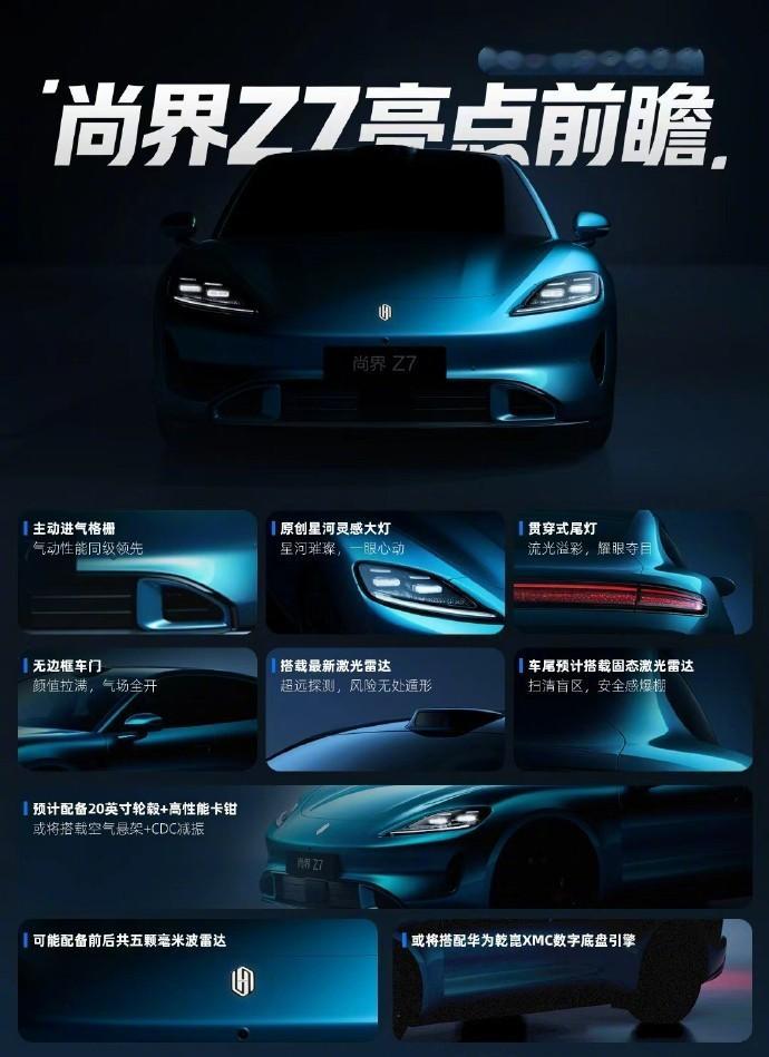 尚界Z7亮点前瞻 给大家总结一下吧:最近有一款鸿蒙智行的新车颇受期待,没错,1 颜值,低趴宽肩长车头+溜背造型,挺漂亮;2 华为乾崑智驾、鸿蒙智能座舱;3 CDC+空悬;4 固态激光雷达;5 巨鲸电池平台。如果定价25-35万,大家觉得有戏吗?
