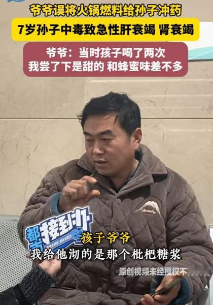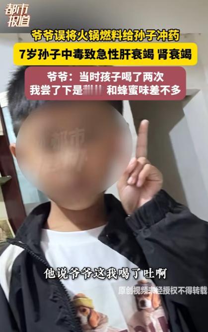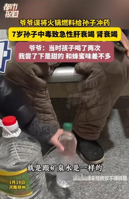 “天都塌了!”河南郑州,一名7岁男孩感冒生病,爷爷就用矿泉水瓶里的水给孩子冲药喝,可孩子喝了一口就发现不对劲,随后更是呕吐不止,神志不清,爷爷打电话问孩子爸爸,才知道里面根本不是矿泉水,而是矿物油燃料。 这段时间河南降温,很多孩子都因为气温的反复无常得了感冒,郑州的7岁男孩轩轩(化名),因为感冒在家休息。 爷爷看着孙子生病十分难受,于是赶紧翻出家里的感冒糖浆,想着冲一杯让孩子喝下发发汗。 转身去厨房找水时,他瞥见桌角放着一瓶 “矿泉水”,瓶身透明,里面的液体清澈见底,和平时喝的纯净水没两样。 爷爷没多想,拧开瓶盖就倒了小半杯,又兑了点温水,把感冒糖浆倒进去搅拌均匀,看着糖浆慢慢化开,才端到轩轩面前。 “乖孙,快把药喝了,喝完病就好了。” 爷爷柔声哄着,轩轩皱着小眉头,接过杯子抿了一小口。刚咽下去,他就猛地皱起脸,小嘴撅着说:“爷爷,这水不对劲,有点怪味。” 爷爷愣了一下,拿起杯子自己尝了尝,舌尖传来一丝淡淡的甜味,还有点像蜂蜜的口感,他以为是感冒药本身的味道,就笑着说:“没事没事,感冒药都这样,有点甜味才好咽,快喝完别浪费。” 架不住爷爷的劝说,轩轩又喝了一小口,可刚下肚没多久,他就捂着肚子皱起了眉头,紧接着一阵剧烈的呕吐,把刚喝进去的药和早饭全吐了出来。 爷爷赶紧递纸巾拍背,可还没等他缓过神,轩轩的呕吐就止不住了,脸色也变的十分苍白,“轩轩!轩轩你怎么了?” 爷爷慌了神,抱着孙子的手都在发抖。 慌乱中,爷爷想起给孩子爸爸打电话,语无伦次地说:“娃喝了药就吐,现在都认不出人了,这可咋整啊!” 电话那头的爸爸一听就急了,追问爷爷用什么冲的药,当听到 “桌角那瓶矿泉水” 时,爸爸的声音瞬间变了调:“爸!那不是矿泉水!是我朋友给的矿物油燃料,准备天冷吃火锅用的,我还没来得及告诉你!” 邻居听到动静赶紧过来帮忙,七手八脚地把轩轩抱上汽车,朝着最近的医院疾驰而去。 一路上,爷爷紧紧抱着孙子,一遍遍地喊着他的名字,浑浊的泪水打湿了孩子的衣服,嘴里不停念叨着:“爷爷对不起你,孙子,是爷爷害了你啊。” 送到医院急诊室时,轩轩已经陷入深度昏迷,嘴唇发绀,呼吸也变得微弱,医生一看这情况,立马拉响了急救警报。 抽血化验的结果出来后,发现这孩子肝肾功能指标严重超标,出现了急性多器官衰竭的症状。 “矿物油燃料里的烃类化合物毒性很强,会直接损伤消化道黏膜,还会快速渗透到血液里,攻击肝、肾等重要器官,儿童的耐受度极低,少量摄入就可能引发严重后果。” 医生一边解释,一边安排轩轩转入 ICU,启动血液净化治疗。 接下来的日子,轩轩一直在 ICU 里靠着呼吸机和血液透析维持生命,全家人都守在病房外,度日如年。 经过几天几夜的紧急抢救,好消息终于传来。主治医师告诉家属,轩轩血液里的中毒药物浓度已经降到了正常水平,神志也清醒了过来,能够勉强睁开眼睛,认出床边的家人。 还没等家人高兴,医生就严肃的表示,虽然孩子目前有了好转,但多器官功能的损伤还需要时间恢复,危险期并没有完全脱离,后续还需要继续接受针对性治疗,观察器官功能的恢复情况,不能有丝毫大意。 矿物油燃料通常是无色透明的液体,和水的外观几乎一模一样,一旦装在矿泉水瓶里,很容易让人混淆。我国每年约有 5 万名儿童因误服毒物送医,其中 90% 的意外都发生在家中,“错装容器” 是最主要的诱因。 很多家庭习惯用饮料瓶、矿泉水瓶分装清洁剂、燃料等危险品,却忽略了这种行为背后的巨大风险,尤其对于老人和孩子来说,很难分辨出包装里的真实物品。 江苏徐州就出过一起类似的事儿,一个 5 岁娃把装在饮料瓶里的洗衣液当成饮料喝了,结果造成食管灼伤。 还有山东聊城,一个老人把装在矿泉水瓶里的酒精当成白酒喝了,直接引发酒精中毒。 这种危险的透明化学物品最好不要用塑料瓶装着,以免引起老人孩子的误食。 危险品的存放容不得半点马虎,不要让熟悉的包装变成隐藏的危险,更不要让一时的疏忽,毁掉孩子的一生。 对于这件事,您有什么想说的吗?欢迎评论区留言讨论。 信源:都市报道2026-01-18——《爷爷误将火锅燃料给孙子冲药,7岁孙子中毒致急性肝衰竭 肾衰竭…》
