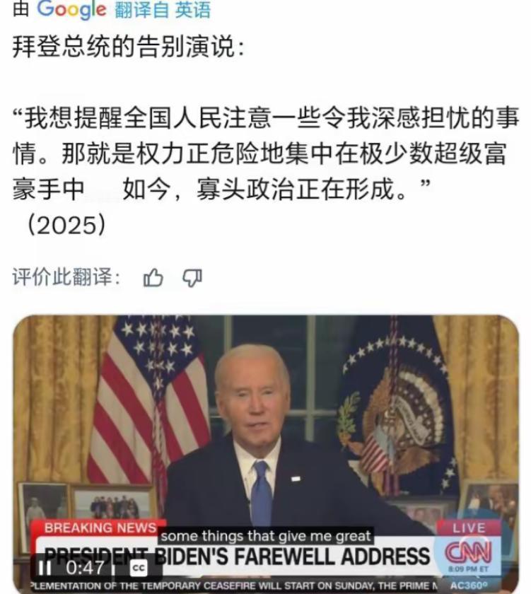 佩洛西将是美国甚至全世界的罪人! 如果不是她逼迫拜登退选,今天的美国和世界也许全然不同。而拜登,你可以说他擅长使用签字笔,你可以吐槽他经常摔倒,你甚至可以认为他也无法在2024年总统选举中取胜,但他却是一个极具远见的人—他在告别演说中的担忧,正在成为现实! 6 月那场电视辩论,拜登的几句卡顿、一次失神,成了佩洛西动手的信号。外界都在调侃他年迈力衰,佩洛西却敏锐地抓住了民主党高层的恐慌。她不找拜登正面硬碰,反倒绕开台面,凭着几十年攒下的人脉网,在背后悄悄吹风。 今天给捐赠大佬递句话 “拜登赢不了特朗普”,明天跟党内议员串个供 “再耗下去民主党要完”,短短两周,“拜登该退选” 的论调就从暗流变成了巨浪。 等到拜登被逼得写下退选亲笔信,那句 “为了党和国家的最大利益”,字字都是身不由己的妥协。可佩洛西连装样子的温情都懒得给,拜登退选才 24 小时,她就迫不及待公开力挺哈里斯,把之前和奥巴马约定的 “党内公平遴选” 抛到九霄云外。奥巴马气得打电话质问,她只轻描淡写一句 “局势不等人”,骨子里全是对权力的掌控欲,哪里还有半分老友的情谊。 她这一闹,民主党直接陷入分裂泥潭。温和派怨她专断独行,毁了有序初选的可能;进步派怒她强行推哈里斯,无视基层诉求。大选现场更是乱成一锅粥,场外抗议者举着标语怒骂民主党亲以政 策。 场内数十名代表对着哈里斯的提名仪式集体沉默,有人甚至当场举牌抗议。原本还能勉强凝聚的力量,被佩洛西一把拆得七零八落,最终特朗普以 312:226 的选举人票大胜,民主党丢了白宫也失了参议院。 可这还不是最糟的。佩洛西亲手掐灭了拜登的远见,让美国的内斗,变成了全世界的麻烦。拜登在告别演说里那些被嘲讽为 “危言耸听” 的警告,如今全成了血淋淋的现实。他说权力会被少数富豪垄断,现在特朗普重返白宫,反垄断调查停摆,超级富豪的财富又涨了一截; 他说虚假信息会搅乱社会,现在社交媒体上的谎言满天飞,连选举结果都被反复质疑;他说 AI 需要监管,如今相关规则形同虚设,技术风险越积越高。 盖洛普调查显示,只有 17% 的美国民众认可国会工作,超过七成的人对国家未来感到迷茫。这不是特朗普一个人的问题,是佩洛西这类政客种下的恶果。 她一辈子都在玩党争游戏,从手撕特朗普国情咨文,到两次主导弹劾,再到故意制造政府停摆,从来都是把国家利益当赌注,把国会权力当党同伐异的工具。2018 年那次 35 天的政府停摆,搞垮了 110 多亿美元的经济,她眼皮都没眨一下,如今逼走拜登,不过是她冷血本性的又一次暴露。 很多人说特朗普是美国的隐患,可佩洛西代表的,是比特朗普更致命的顽疾 — 为了权力不择手段,为了党争撕裂国家。特朗普是明面上的混乱,佩洛西却是暗地里的蛀虫,一点点啃食美国的制度根基,让两党政治彻底沦为闹剧,让民众对政府的信任跌到谷底。 更可怕的是,这份混乱早已溢出美国国界。民主党因为内斗频繁摇摆外交政策,全球盟友对美国的信任越来越弱;单边主义和民粹主义趁机抬头,国际秩序被搅得动荡不安。 那些本可以通过拜登的政策规避的风险,那些本可以缓和的国际矛盾,全因为佩洛西的一己私欲,走向了更糟的方向。 佩洛西从来不是什么政坛传奇,只是个冷血的权力玩家。她用五十年的友情换自己的权势,用民主党的分裂换一时的掌控,最终让拜登的担忧变成现实,让美国的衰败牵连整个世界。 等到后人回望这段历史,她不会被铭记为首位女性众议院议长,只会被钉在耻辱柱上,成为跨越国界的罪人 , 一个用野心毁掉一切的、最可悲的政客。