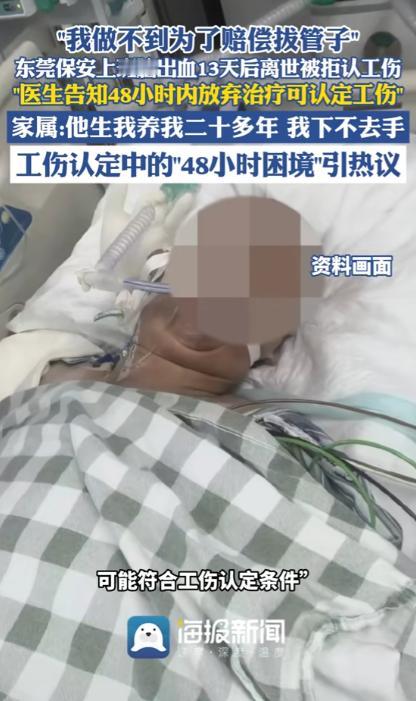 “我做不到,为了赔偿拔管子!”! 东莞,保安父亲上班脑出血,医生告知儿子48小时内放弃治疗,可认定工伤!儿子:“他生我养我二十多年 我下不去手……”13天后,父亲还是抢救无效死亡,申请工伤认定被拒,网友炸锅! 医院重症监护室外的走廊里,东莞小伙小陈(化名)的脚步声在寂静中格外清晰,她的父亲躺在重症的病房内,身上插满了管子。 但就在十几个小时前,父亲还是小区里认真巡逻的保安,顶着南方的烈日检查消防设施、登记访客信息,可一场突如其来的脑出血,让这个普通家庭的生活瞬间崩塌。 2024年11月1日下午,小陈的父亲在工作岗位上突发脑出血,被紧急送往医院,当小陈赶到医院的时候,他的父亲已经失去意识,医生拿着病危通知书,语气沉重地告知他患者已双侧瞳孔散大,被诊断为脑疝,医学上基本没有逆转可能。 考虑到患者是在工作时出现的情况,根据相关规定,如果在 48 小时内放弃治疗,父亲的情况可以视同工伤,家属能获得相应的工伤保险待遇;可要是超过这个时间,后续的工伤认定可能会遇到极大阻碍。 这让小陈非常的痛苦,亲戚们有人私下劝他 “理性考虑”,毕竟人肯定是救不回来了,但是生活还要继续,不如要一笔工伤赔偿款算了。 可小陈看着监护仪上父亲微弱的心跳,只觉得喉咙发紧,反复说着 “我做不到,他生我养我二十多年,我下不去手……” 接下来的 13 天,小陈和家人日夜守在医院,不放过任何一丝希望。他们凑钱支付高额的抢救费用,请专家会诊,看着父亲在医生的救治下偶尔能睁开眼睛,哪怕只是短暂的清醒,都让他们觉得坚持有意义。 小区里的邻居和父亲的同事们也纷纷赶来探望,有人带来了捐款,有人帮忙联系律师,大家都盼着这个老实本分的保安能挺过来。可命运终究没有眷顾这个家庭,在与死神抗争了13天后,父亲还是没能留住,抢救无效宣告死亡。 处理完父亲的后事,小陈抱着一沓厚厚的材料为父亲申请工伤认定,可最终收到的却是不予认定工伤的决定书,理由是父亲的死亡时间超过了《工伤保险条例》中 “48 小时之内经抢救无效死亡” 的视同工伤情形。 这件事被发到网上后,迅速引发了网友的热烈讨论,大家纷纷为小陈的孝心点赞,同时对工伤认定的 “48 小时条款” 提出了质疑。 有网友留言说:“换成任何人都不会为了赔偿放弃亲人的生命,48 小时的规定太冰冷了”,还有网友分享了类似的经历,感慨这种规定让家属陷入两难。 随着医疗技术的发展,很多重症患者在先进设备和药物的支持下,能够维持生命体征超过 48 小时,这让原本的时间限制显得越来越不合时宜。 全国人大代表也曾提出建议,希望完善 “48 小时之限” 的规定,对于 48 小时外抢救无效死亡的情况,如果能证明与工作有关联,就应认定为工伤,同时调整连续转院治疗时 48 小时的起算时间。 最高人民法院也曾发布相关典型案例,对类似情况进行纠正,比如有人被确诊脑死亡后因器官捐献导致死亡证明超 48 小时,最终被依法认定为工伤。 在东莞这起案件中,小陈的孝心得到了全网认可,他没有因为工伤待遇而放弃对父亲的治疗,用行动诠释了 “百善孝为先” 的传统美德。 法律不应该让坚守孝道的人寒心,制度的设计应该更多地体现人文关怀,让每一位劳动者的权益都能得到充分保障,这才是工伤保险制度的初衷和意义所在。 对于这件事,您有什么想说的吗?欢迎评论区留言讨论。 信源:海报新闻2026-01-15——《"我做不到为了赔偿拔管子"东莞保安上班脑出血13天后离世被拒认工伤…》