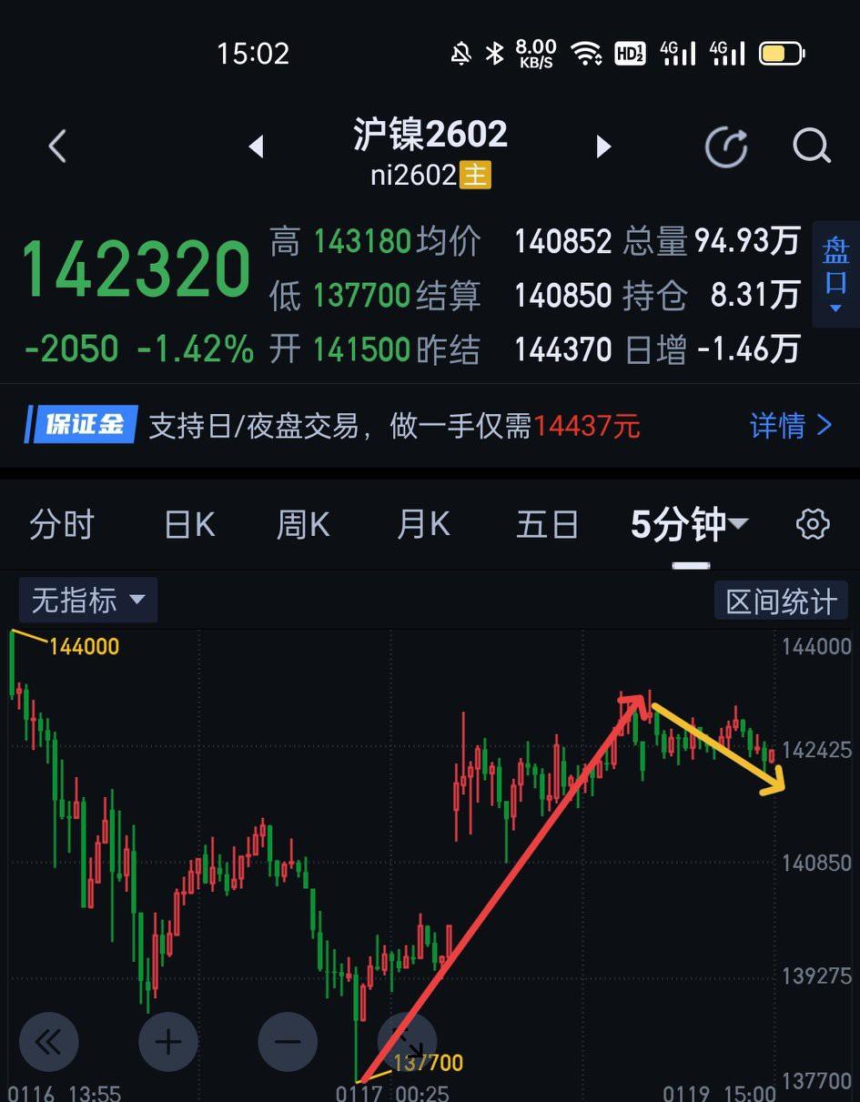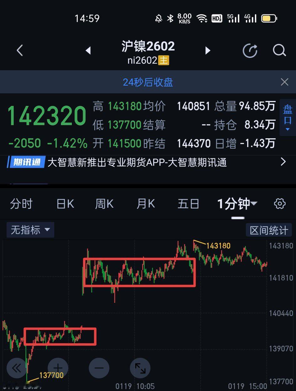 沪镍2602,今天两个秒级上涨中枢背驰后结束了五分钟一笔上,目前从143180开启的五分钟一笔下仍在生长中。在141410被破坏前,还难言目前的五分钟下有多大空间,所以做空一定要设好止损,如果夜盘顺利下破141410,可以把止损变止盈继续跟随,结构上要防止目前的五分钟下结束于137700上方,那样的结果就是走势将再次演化成一分钟中枢的震荡,后面新的方向产生只能等待围绕该中枢产生三买或三卖后再定夺。