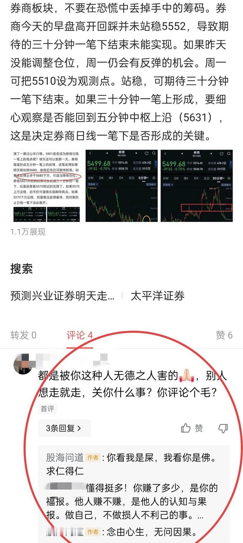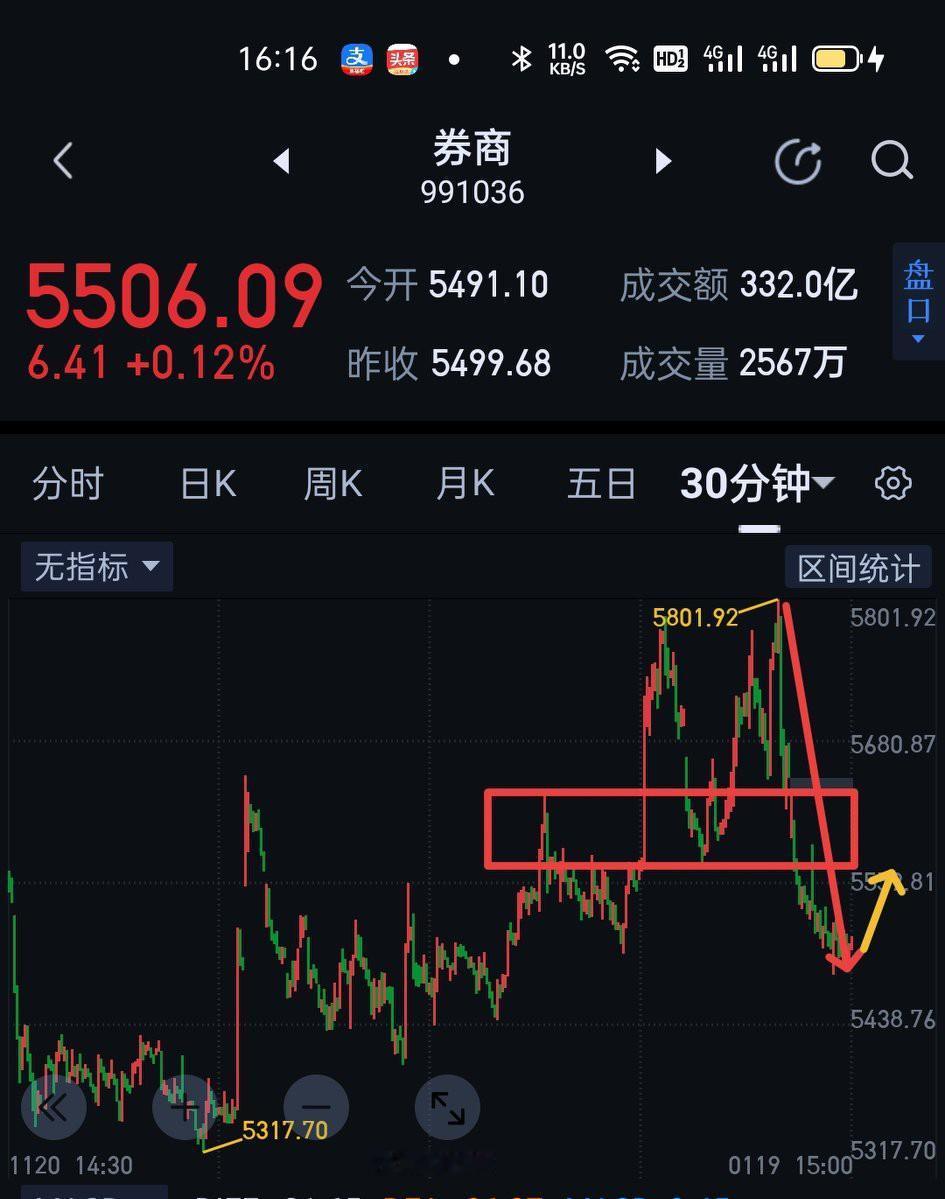 券商板块,今天小幅收涨,走势结构在5分钟图上已经由前两日的下跌变为震荡。明天仍需观察围绕5510点的争夺,如5510站稳,三十分钟一笔上的反弹将随时展开。如果想调整仓位,可等三十分钟上完成再做决定。节奏上不要受情绪影响,追涨杀跌,慌乱中丢掉手中的筹码。有个小插曲,前面的文章可能是触碰了某些马甲的利益,被友情提示啦。