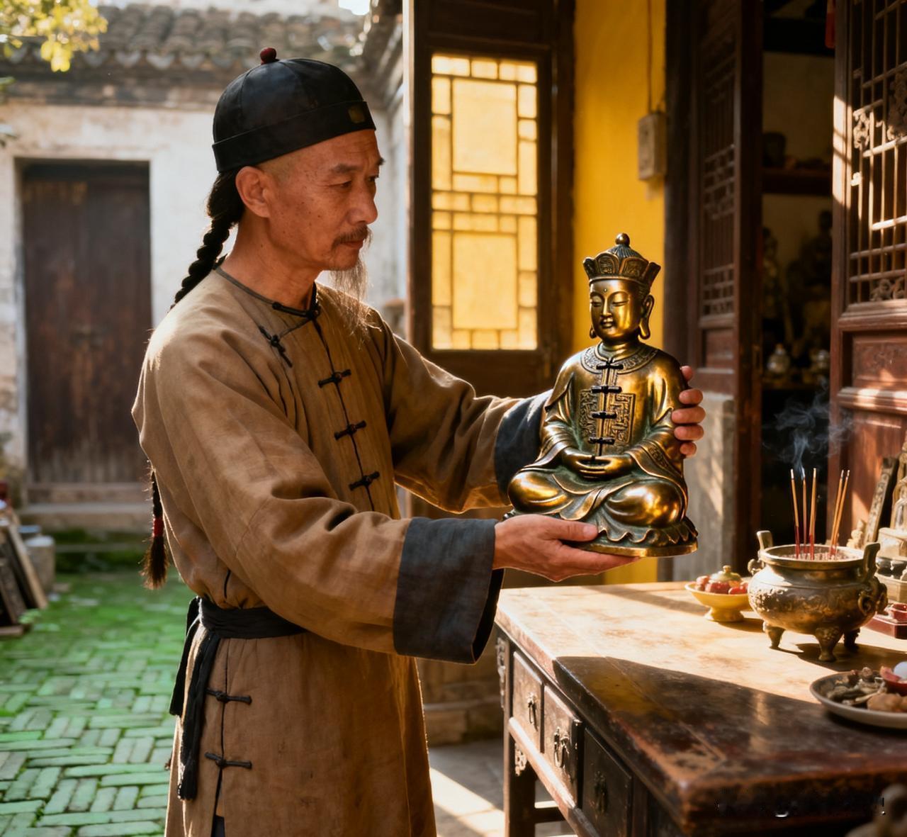 康熙年间,湖广有个叫朱方旦的人,妻子早逝后一心修道。一次他在旧货铺淘到一尊铜佛,佛像穿着像宫里太监的衣裳,朱方旦对它十分虔诚,日日祭拜了整整三年。 这尊铜佛不过巴掌大小,铜身被岁月磨得发亮,太监服饰的盘扣、衣纹都雕刻得格外精细。朱方旦把它供在自家小院的正屋案上,每日清晨净手焚香,傍晚添灯诵经,哪怕逢上雨天路滑,或是冬日寒雪,从未间断。乡邻们起初觉得他古怪,一个修道人不拜三清不奉老君,反倒对着个穿太监服的铜佛上心,背地里难免议论几句,但朱方旦从不在意,依旧我行我素。 三年后的一个夏夜,湖广一带突降暴雨,雷声滚滚震得窗棂发颤。朱方旦像往常一样给铜佛上香,刚点燃的线香突然无风自晃,火星溅落在案前的蒲团上。他急忙伸手去拍,指尖却无意间触到了铜佛的底座,那冰凉的铜身竟微微发烫,底座内侧似乎还藏着什么硬物。 雨停后,朱方旦小心翼翼地将铜佛翻过来,用小刀轻轻撬开底座的暗格,里面藏着一张泛黄的绢纸,上面用小楷写着几行字。字迹有些模糊,他凑近油灯细看,才知这尊铜佛的来历——原来前朝万历年间,宫里有位姓陈的太监,为人忠厚,见不得百姓受苦,常常偷偷将自己的月钱拿出来接济宫外的孤儿寡母。后来他年老出宫,用毕生积蓄铸了这尊佛像,把自己的心愿刻在绢纸上,希望得佛者能传承善心,多做善事。 朱方旦看着绢纸,心里忽然亮堂起来。他想起自己妻子在世时,两人也常帮衬邻里,如今妻子不在了,他潜心修道,却忘了修道的本质原是修心向善。从那天起,朱方旦变了模样,不再只守着小院祭拜铜佛,而是常常背着药箱走村串户。他年轻时跟着岳父学过些医术,如今便免费给乡亲们看病,遇到家境贫寒的,还会自掏腰包买药。 乡邻们渐渐对他改观,都说朱方旦得了佛缘。有一年湖广闹旱灾,田里的庄稼都蔫了,不少人家断了粮。朱方旦把自己多年积攒的粮食拿出来,在村口搭起粥棚,又带着乡亲们挖井抗旱。他白天领着大伙找水源,晚上就对着铜佛诵经,不是祈求神迹,而是在心里给自己打气,也给乡亲们鼓劲。 奇怪的是,自从搭起粥棚,原本干涸的河道竟慢慢渗出了细流,挖井的乡亲们也在三丈深处挖到了泉水。消息传开,越来越多的人加入抗旱队伍,大家齐心协力,终于熬过了旱季。有人说这是铜佛显灵,朱方旦却笑着摆手,说哪有什么神迹,不过是人心齐泰山移,再加上老天眷顾罢了。 后来,朱方旦的善事传到了知府耳中。知府感念他的善举,特意上书朝廷,请求表彰。康熙皇帝得知后,也颇为赞赏,下旨赏赐他绸缎百匹,还御笔题写了“善道传家”四个大字。朱方旦没有把赏赐据为己有,而是用绸缎做了衣物分给贫苦百姓,把御笔题字挂在村口的祠堂里,勉励乡亲们多行善事。 岁月流转,朱方旦渐渐老了,他收了两个徒弟,一边教他们医术,一边叮嘱他们要传承铜佛的心愿,多为百姓谋福。直到他七十岁那年安详离世,乡亲们为他立了一块碑,碑上没有刻太多华丽的辞藻,只写着“善人朱方旦之墓”。那尊穿太监服的铜佛,被徒弟们供奉在祠堂里,成了当地的一段佳话。 人们常说,佛在心中,善在言行。朱方旦用三年虔诚祭拜,换来了一次心灵的觉醒,又用一生的善举,诠释了修道的真谛。那尊小小的铜佛,或许本无神力,但它承载的善心与善意,却在岁月中不断传递,温暖了一代又一代人。 本文根据《清稗类钞》相关记载改编