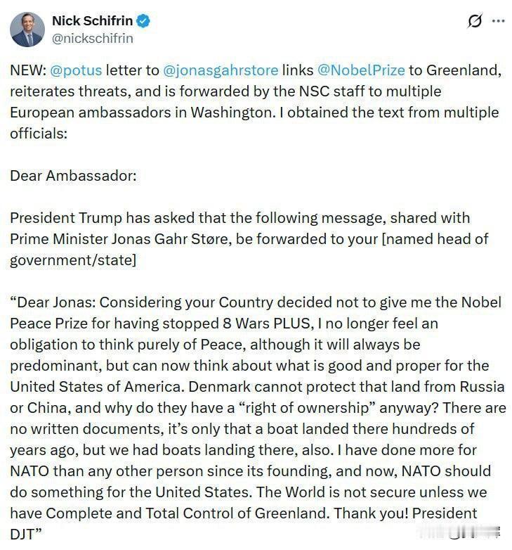 【特朗普:“没给我诺贝尔和平奖,所以我不会满脑子想着和平”】 美国总统特朗普致信挪威首相约纳斯·加尔·斯特勒,称因未获颁诺贝尔和平奖,他便无需承担“只一心为和平考量”的义务。这封信由美国公共广播电视公司新闻频道记者尼克·希夫林对外公布。 特朗普在信中宣称,他曾阻止了“八场及以上的战争”,但诺贝尔委员会却未对此予以认可。显然,他并不满足于马差多将和平奖章转手给他。特朗普表示,如今他可以专心致志地做“对美国有益且正确的事”。 特朗普还再度重提格陵兰岛议题,对丹麦拥有该岛的合法性提出质疑: “这里不存在任何书面文件佐证丹麦的主权,唯一的依据不过是数百年前曾有丹麦船只在岛上登陆——但当年我们的船只也曾抵达过那里。自北约成立以来,我为北约所做的贡献远超其他任何人,现在北约应当为美国做些实事。如果我们无法完全掌控格陵兰岛,世界的安全便无从谈起。” 希夫林透露,特朗普的这封信目前正被分发给驻华盛顿的欧洲各国大使。