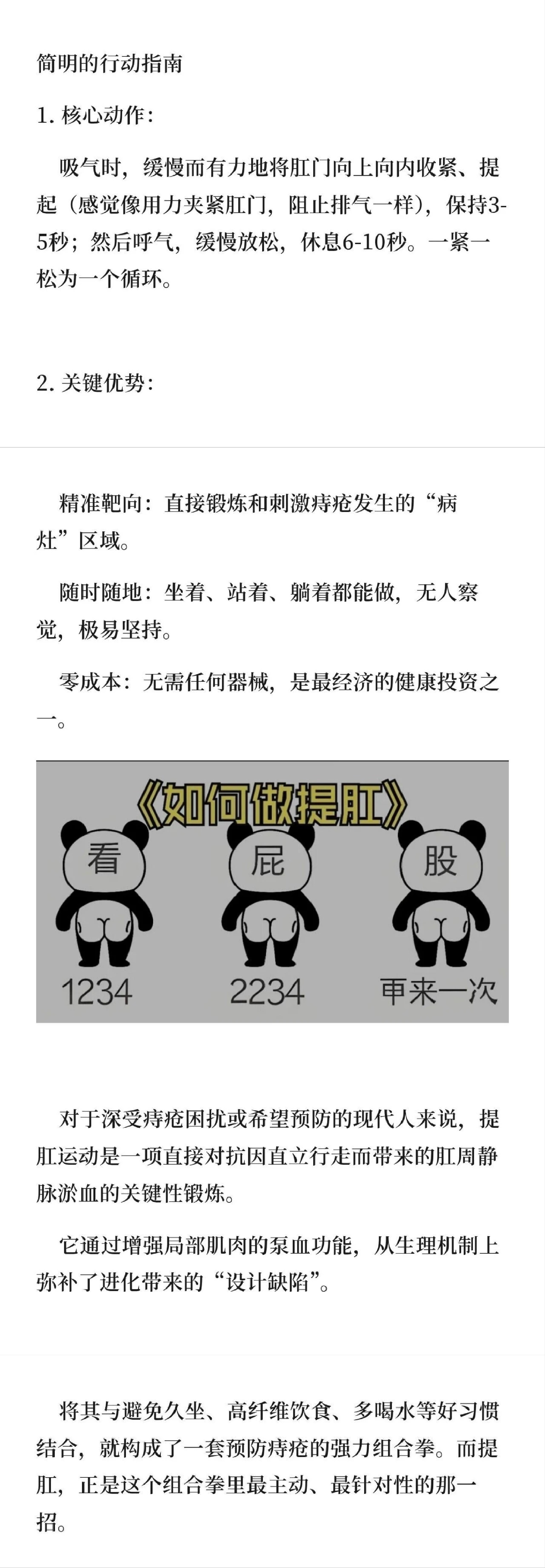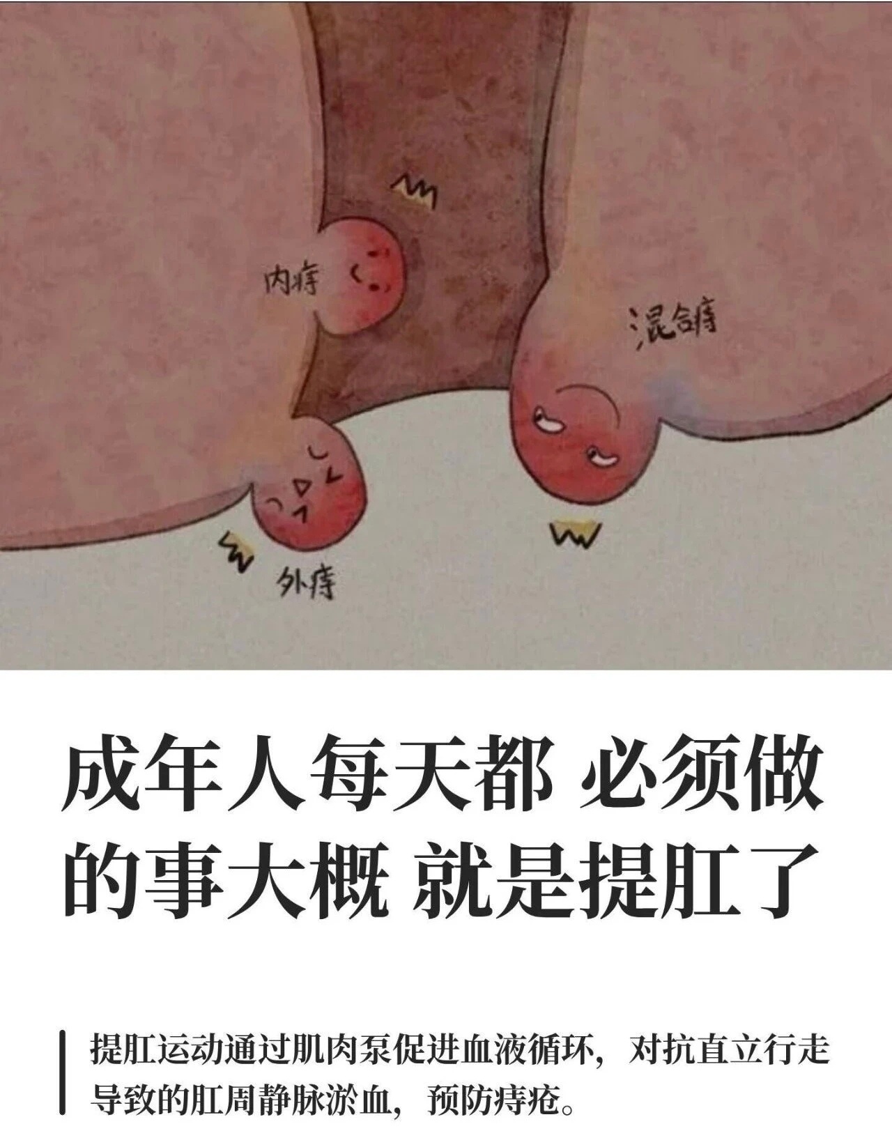 提肛是成年人每天必须做的事,对于深受痔疮困扰或希望预防的人群来说,提肛运动是一项直接对抗因直立行走而带来的肛周静脉淤血的关键性锻炼,能通过增强局部肌肉的泵血功能,从生理机制上弥补了进化带来的“设计缺陷”。满谈健康坚持日常提肛运动,再结合避免久坐、高纤维饮食、多喝水等良好习惯,可以有效预防痔疮,并能降低男性前列腺术后漏尿率40%,以及女性产后压力性尿失禁风险。