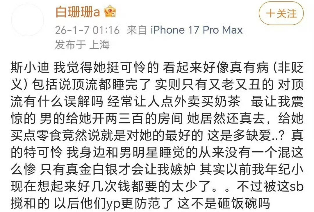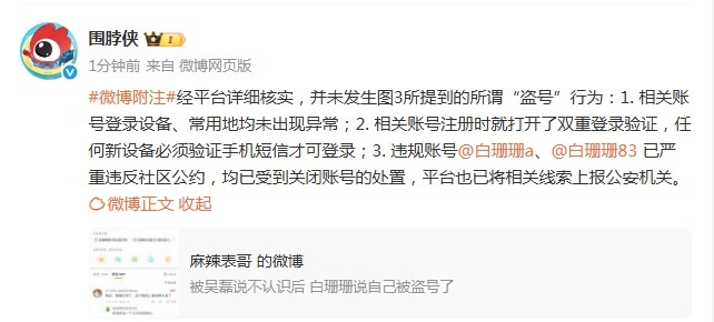 看了“吴磊白珊珊隐私争议”前因后果,整个人感觉很困惑,这是什么造谣起号新模式?前有司晓迪担心被追责、忙着删博,后有白珊珊假装被盗号,关键是还都占用网络公共空间,不仅是吃个“假瓜”的问题,若不严肃处理,会滋生更多类似造谣行为。平台辟谣白珊珊被盗号白珊珊违规账号已被关闭并上报公安很多明星艺人遇到类似造谣行为,即便个人清白,也担心正面硬刚发声,不仅给造谣者进行“流量加持”,更有其他问题被翻出,大多选择沉默,或工作室辟谣发声,主要以“律师函警告”为主,导致造谣者鲜有受到法律处罚。造谣者则是“光脚不怕穿鞋”的心态,针对娱乐圈某个人的造谣抹黑,比造谣其他行业,被追究的概率低,同时有更多的流量、变现。基于以上原因。很多整容不整脑子的网红,把造谣明星当成了快速起号、变现的渠道。平台辟谣白珊珊被盗号