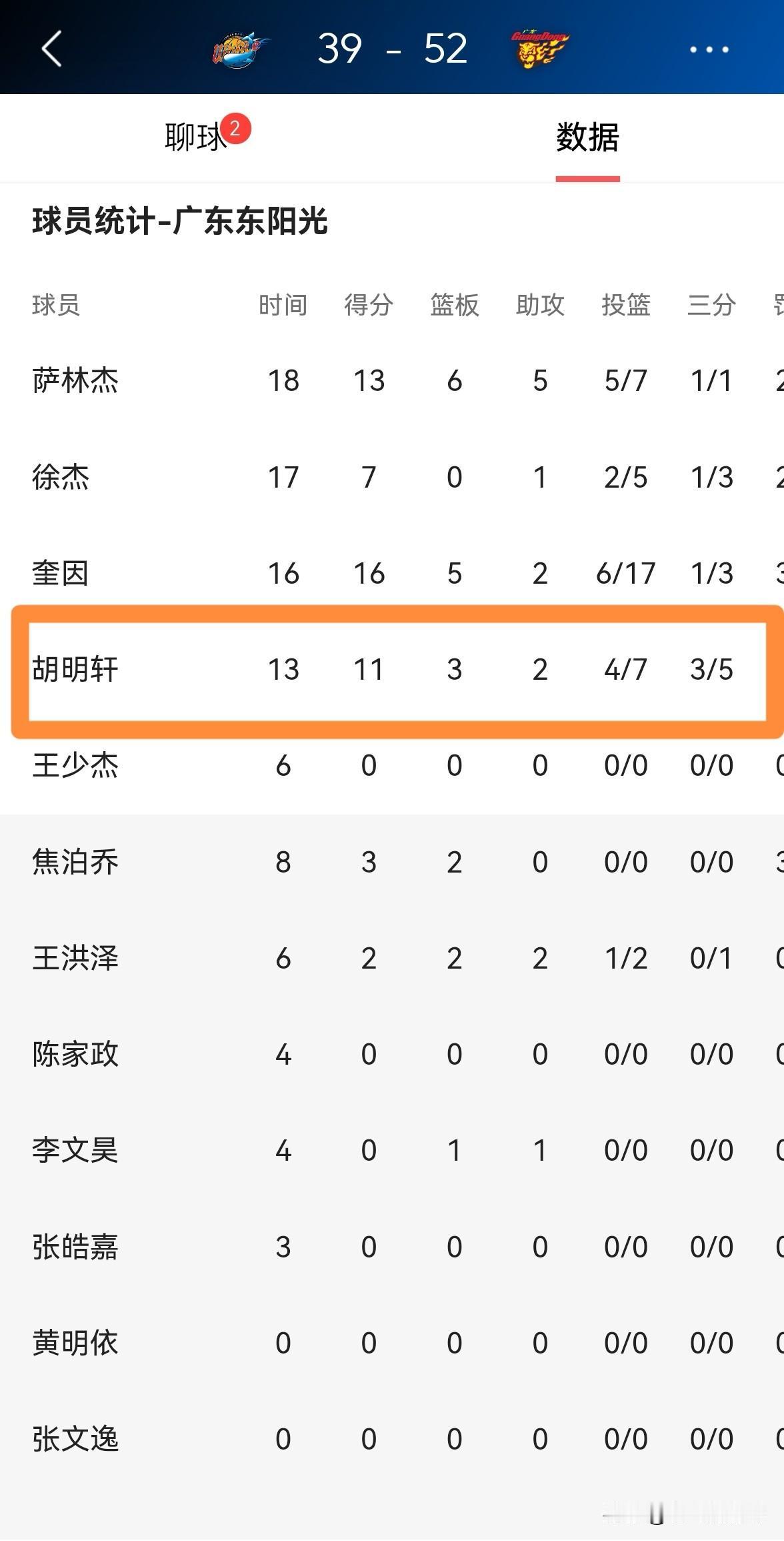 广东东阳光球星胡明轩彻底的摆脱低迷了!在今天进行的广东东阳光和四川丰谷酒业的比赛中,目前双方的上半场比赛已经结束,广东东阳光以52:39领先对手13分。在前两节比赛中,胡明轩延续了上一场比赛的出色状态,他在首发出战的13分钟里,投篮7中4,其中三分球5中3非常高效的砍下11分,还有3篮板2助攻。 以目前的情况来看,胡明轩已经彻底的摆脱了之前的低迷,随着胡明轩的状态变得越来越好,广东东阳光的战绩一定会蒸蒸日上。