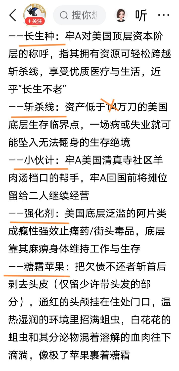 喜欢看斯奎奇大王(牢A)切片的新人,可能对其中的暗语还不太了解,这位博主整理的新人必备知识很不错,除了“拼高达”不对,其他都大差不差,看完这样暗语以后看切片就容易理解了。 牢A说的“拼高达”意思是指拼尸体,他在教授的介绍下给师兄打下手,也就是课余时间从事收尸人工作,实际上相当于法医助理。因为不管是为了研究死因还是后续处理,各种原因导致的非完整的尸体碎片都有必要被尽可能拼接完整。 牢A也正是因为这项工作,得以接触到美国底层人群以及当地社会的黑暗面,这才有了捅破美国滤镜言论的诞生! 另外补充一点,截图里牢A口中的小伙计一个14岁,另一个12岁,他认的教子(义子)今年5岁。