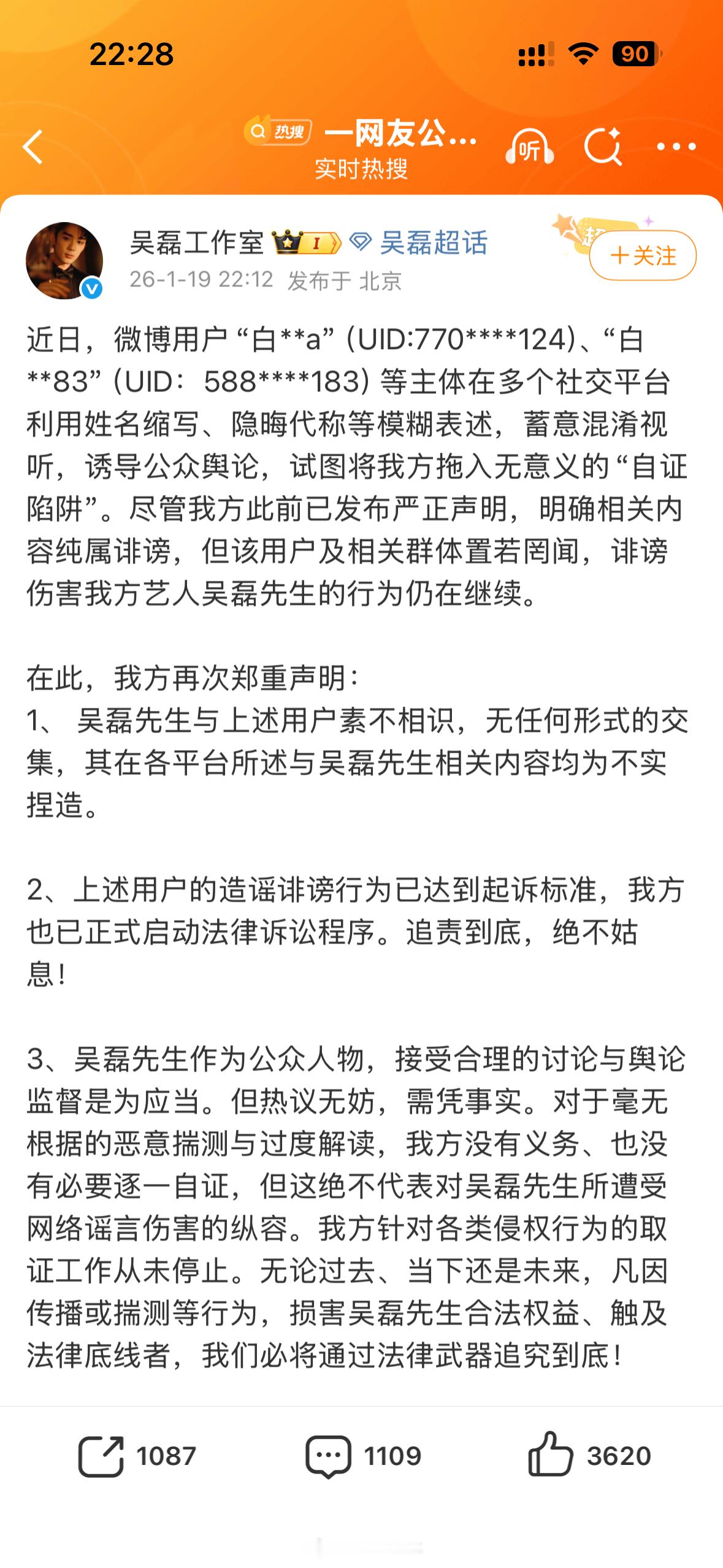 吴磊工作室再次发文,表示会追责白珊珊