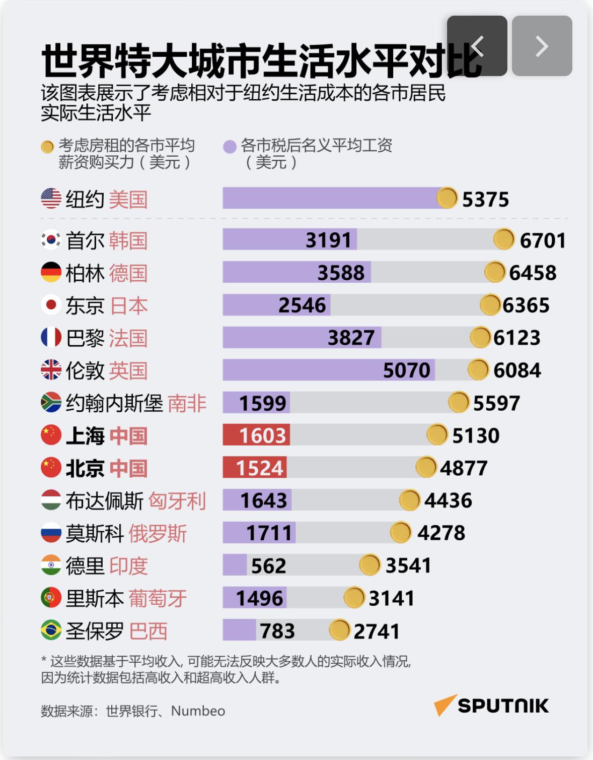 中国与其他国家相比生活水平如何? 俄罗斯卫星通讯社 2026年1月19日, 09:35 (更新: 2026年1月19日, 14:13) 俄罗斯卫星通讯社选取并汇总了世界不同国家及城市的生活水平统计数据。据世界银行数据显示,中国的人均GDP略高于世界平均水平。据该组织评估,中国属于中等偏上收入国家,低于美国、欧盟各国、俄罗斯、韩国和日本,但高于南亚、东南亚、非洲大多数国家以及拉丁美洲的许多国家。与此同时,统计数据显示,上海和北京等大城市的实际生活水平几乎不逊于纽约。