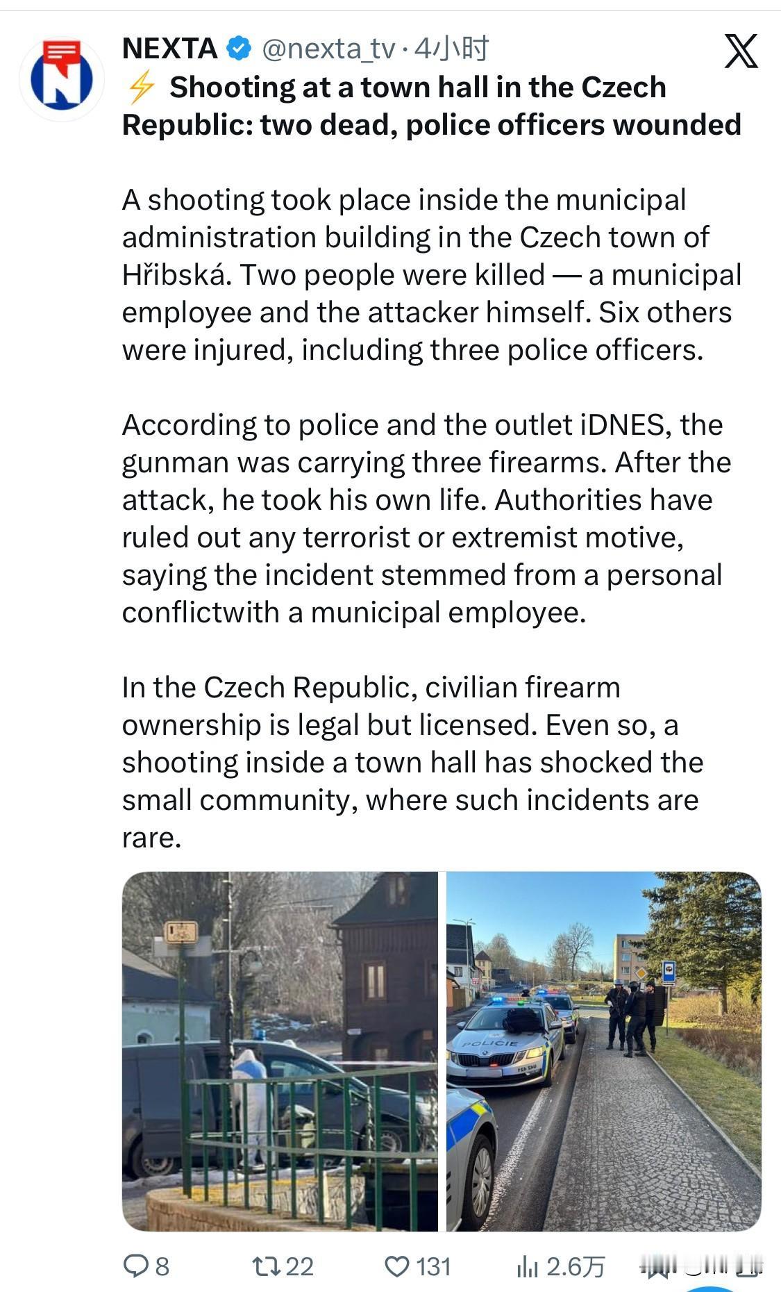 突发:据NEXTA 的报道称,捷克 Hřibská 镇市政厅发生了一起枪击案,两人死亡,多名警察受伤。 Hřibská 镇位于捷克北部,靠近德国边境,人口约 1,300 人。 捷克赫日布斯卡镇市政厅大楼内发生枪击事件。两人死亡——一名市政工作人员和枪手本人。另有六人受伤,其中包括三名警察。 据警方和iDNES报道,枪手携带了三支枪。袭击发生后,他自杀身亡。当局已排除恐怖主义或极端主义动机,称该事件源于枪手与一名市政雇员的私人恩怨。 在捷克共和国,平民拥有枪支是合法的,但需要获得许可。即便如此,市政厅内发生的枪击事件仍然震惊了这个小型社区,因为此类事件在这里极为罕见。