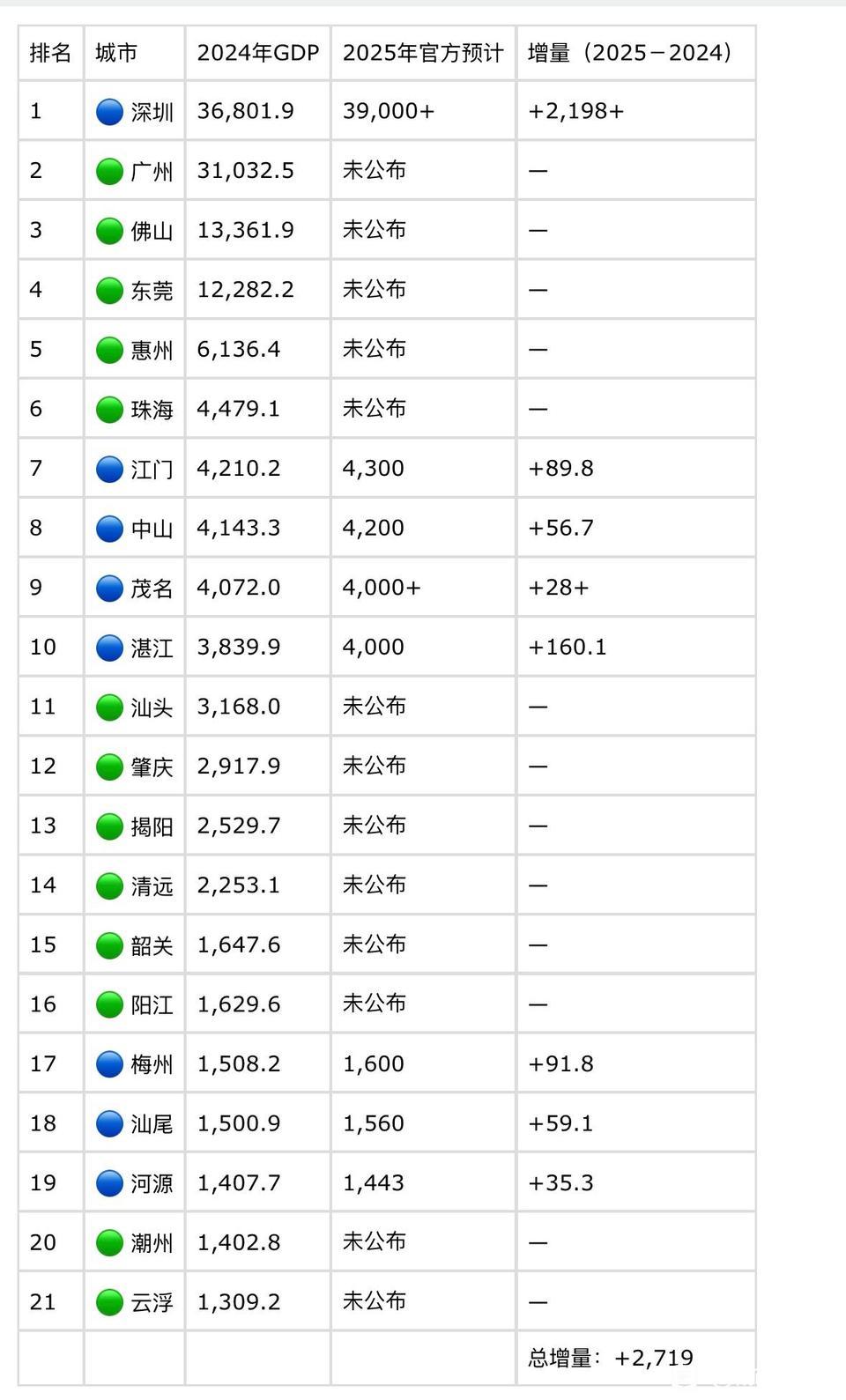 广东8个城市2025年官方预计GDP数值出炉:深圳突破3.9万亿、茂名湛江携手突破4000亿、梅州破1600亿 广东是我国经济第一大省,截止目前,广东已有8个城市2025年官方预计GDP数值出炉了,深圳经济总量突破3.9万亿,较2024年增加了2198亿,位居全省榜首。 江门和中山分别突破4300亿和4200亿大关,位居全省第7-8名;茂名和湛江2025年GDP总量携手突破4000亿大关,较2024年分别增加了28亿和160.1亿。 梅州突破1600亿,较2024年增加了91.8亿,汕尾和潮州分别实现4560亿和1443亿,较2024年分别增加了59.1亿和35.3亿。