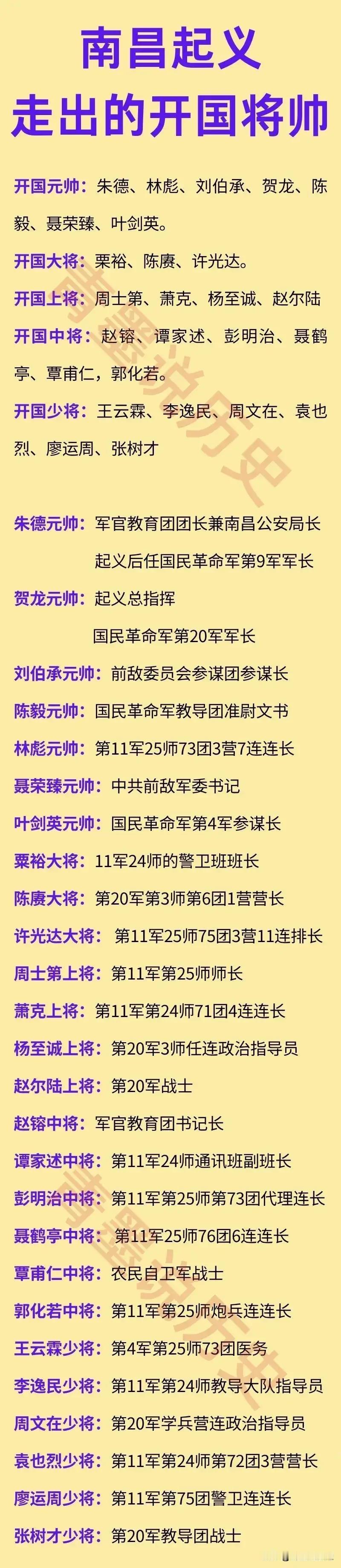 从南昌起义走出的开国将帅一览! 在起义时,他们当中有的已经是军长、师长等高级指挥员,有的是连长、排长等基层干部,有的还只是普通战士,虽然他们的身份有所不同,但他们有着同样的理想信念,共同踏上了一条艰难的征途,为了革命信仰而奋斗。 从南昌起义开始,他们经历了红军长征、抗日战争、解放战争,在革命道路上一路淬炼,不懈奋战,为新中国的诞生做出了重要贡献,向每一位从南昌起义走出的先烈致敬!
