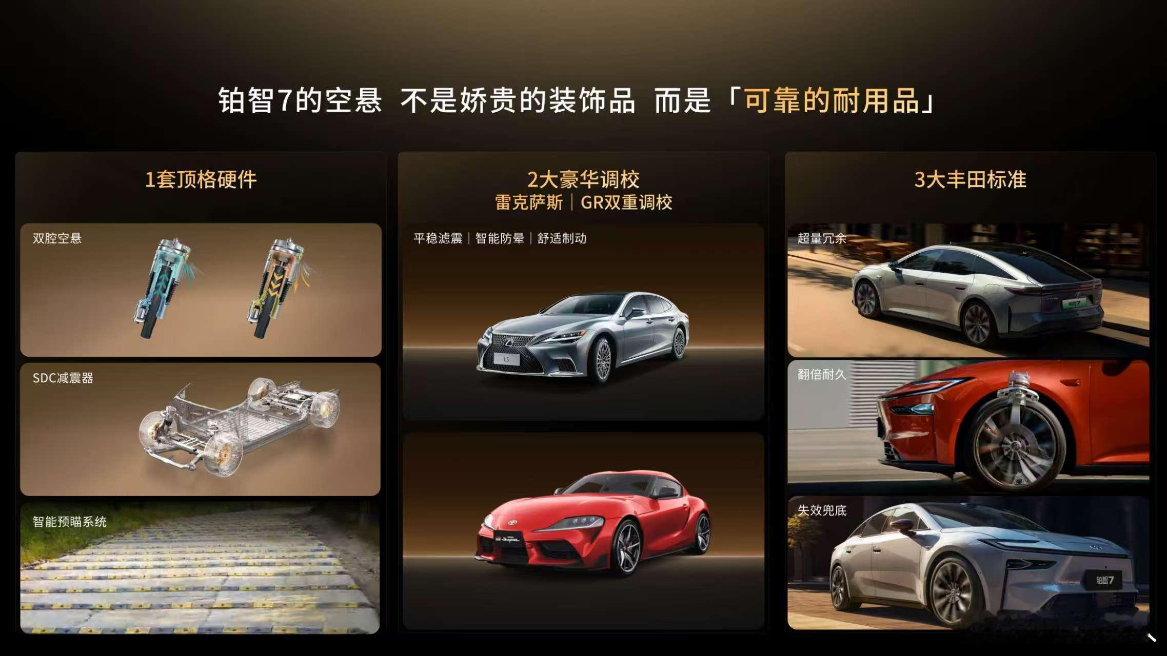 30万为什么是所有主机厂的价格锚点?车型定价的时候都要参照这个来定。豪华品牌基本都是锚着30万做定价的,无论是BBA还是国产新势力,最新上市的几个新车都很明显,主要就是因为30万是一个豪华分水岭!什么能定义豪华?在当下这个市场,能把传统豪华的高级质感和新势力的智能化和舒适配置结合起来,品牌不错的情况下如果能到30万以内,那就是豪华,马上有一台新车就刚好满足所有条件……高级质感分两部分,一个是硬件一个是调校,硬件就是更高级的悬挂,那必定是双腔空悬,调校必须是国际大厂,因为他们有足够的数据和实力能优化好,按照中国市场还得大,532豪华大车格说的是车长超5m、轴距超3m、车宽近2m,说白了就是二排老板要能翘二郎腿,要舒服还得零重力座椅,智能化就是Momenta R6智驾+华为满血版鸿蒙座舱,这两个基本在国内也算到顶了,目前市面上配齐这豪华五大件的只有30万以上车型,铂智7是行业里首次把这豪华五大件打入30万内的车型,直接一次性配齐了。铂智7把豪华五大件一次性配齐话说回来,光推料肯定不是豪华,除了国际大厂标准的标准之外,更主要的是铂智7融入了丰田自身的深层思考与特色,比如在三电系统上,特别是电池的安全性丰田其实摈弃了一些业内常见的策略,采用了一种更安全可靠的物理策略,在刹车上做了3段冗余设计,能保证任何一个环节失效都能刹得住等等,这些都融入了丰田的深层思考与谨慎的特点,所以这台车会是一个国内市场此前没有的豪华车,也丰田的首款真正豪华纯电旗舰,丰田豪华旗舰铂智7定于3月上市,大家可以期待一下……