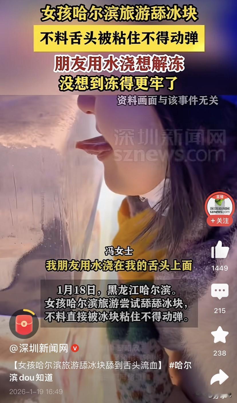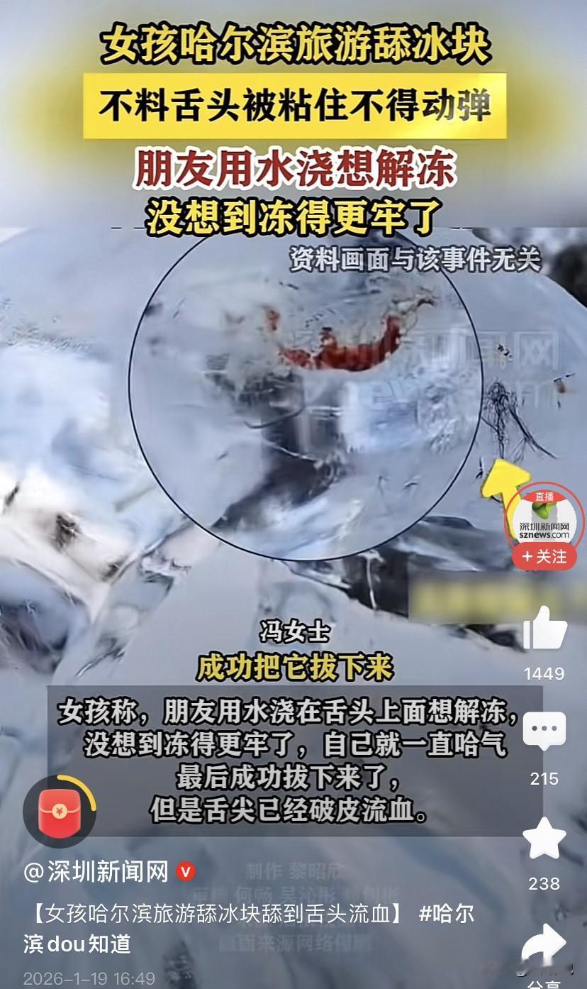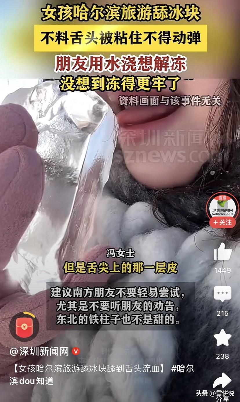 还真有不信邪的!黑龙江哈尔滨,一名南方姑娘到冰雪大世界游玩,不信舌头会粘到冰上,就以身试法,结果刚一贴上后拿不下来了,朋友见状连忙浇水,结果冻的更牢了 冯女士称,自己在来之前,就在网上看过东北的冬天不要好奇用舍友舔冰块和电线杆,结果看到冰雕后,好奇心还是上来了,舔了上去 结果舌头刚贴上去,瞬间就被冰粘住了。那一凉,心里就知道:坏了,真粘上了 朋友在旁边也慌了,赶紧拿水去浇,谁知道凉水一冲,冻得更加结实 最终冯女士就靠自己哈气,一点一点硬是把舌头给拔了下来,但也在冰块上留了自己的痕迹 说实话,这种事儿在东北其实不算新鲜,每年冬天总能听说几回。原理倒也简单,舌头表面有唾液,碰到极冷的冰,热量被迅速吸走,唾液瞬间结冰,就把舌头和冰紧紧粘在一起。要是硬扯,很容易伤到皮肤。所以有经验的人都知道,万一真粘上了,得用温水慢慢浇,不能直接用凉水,更不能生拉硬拽 我觉得,人有点好奇心不是坏事,但有些经验之谈,真不是吓唬人的。尤其是到了陌生的环境里,对自然、对气候得存一点敬畏。北方冬天的冷,是一种实实在在、能“咬人”的冷,和南方的湿冷不一样。很多在南方看来不可思议的事,在这里就是日常 冬天来北方玩,安全第一,好奇第二。护好耳朵、手、脚,享受冰雪之美,别让舌头去碰冰——这话,真的不是玩笑。