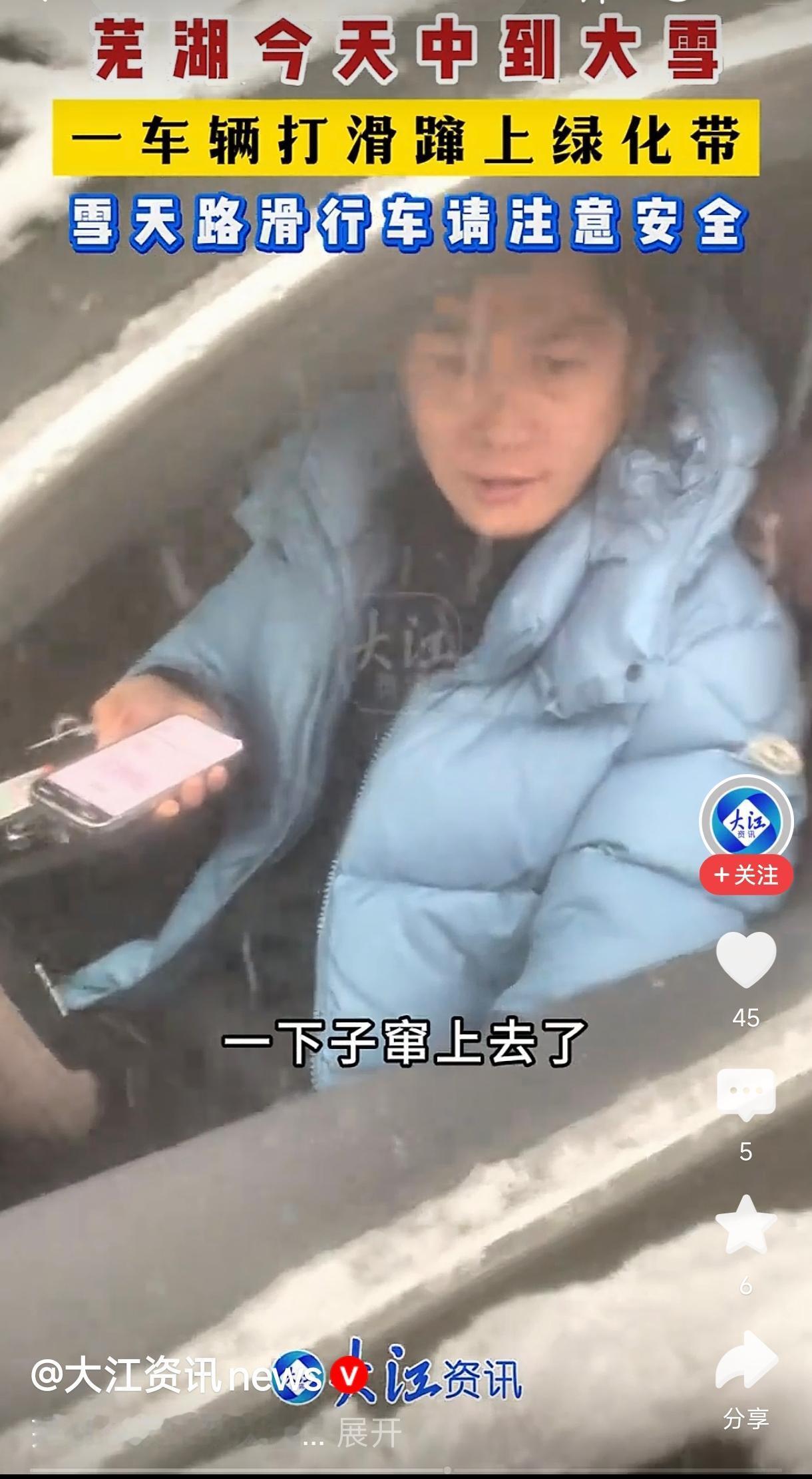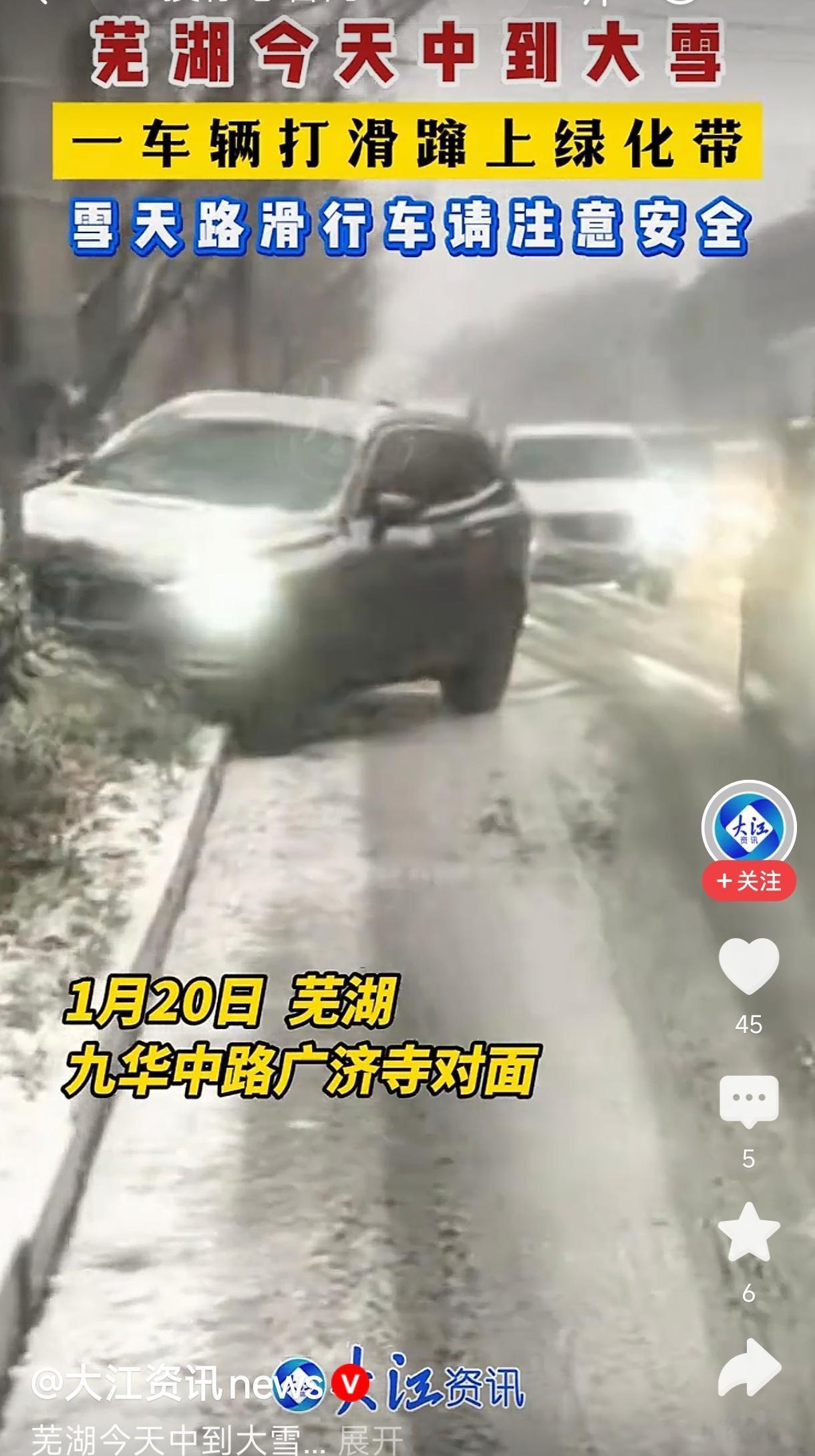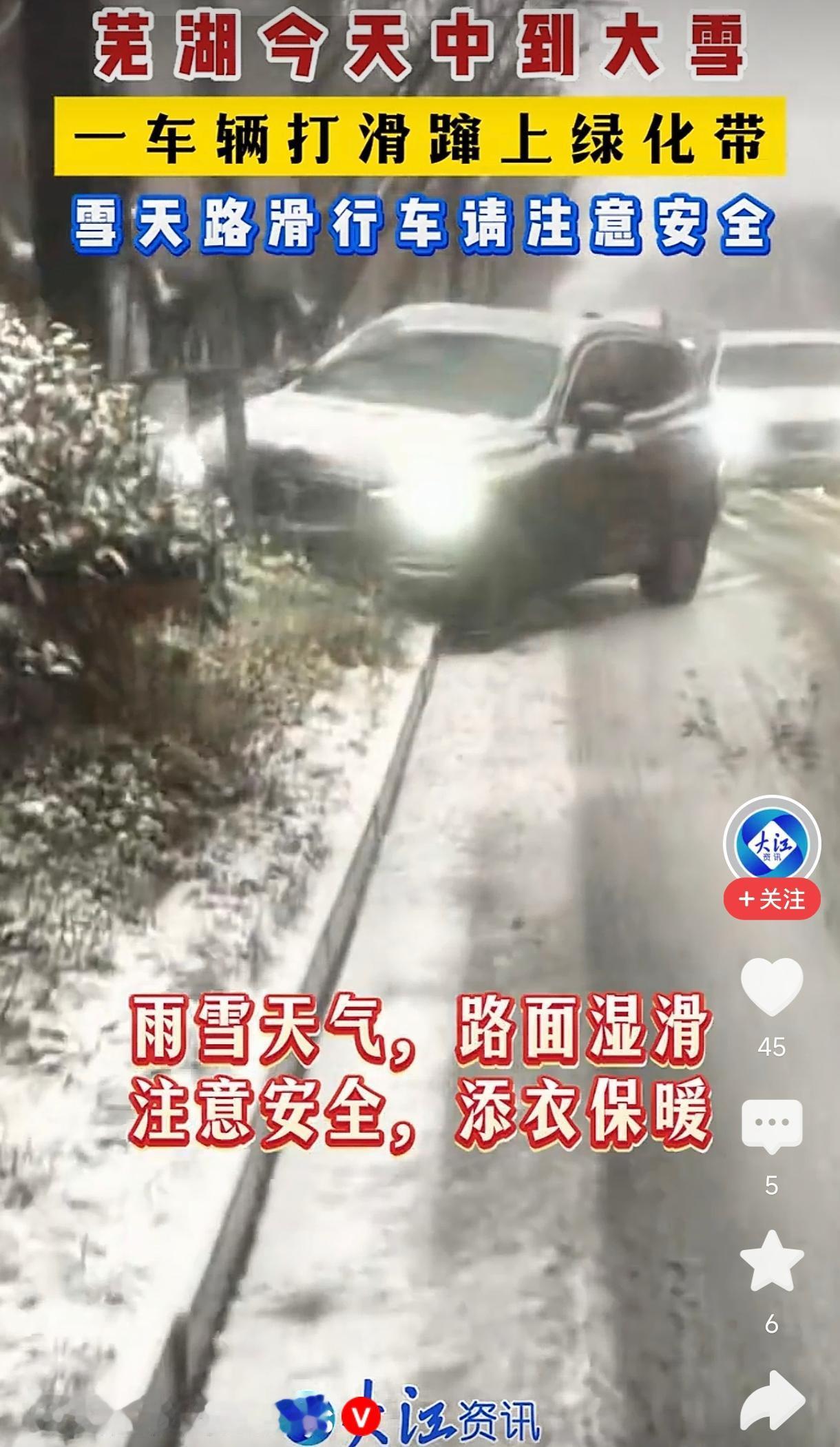 雪天车辆打滑蹿进绿化带 在芜湖今天出现中到大雪的天气,路面变得湿滑,导致一辆车辆在雪天行驶时打滑,冲入了绿化带。此类事故提醒广大司机在雪天行车时务必减速慢行,保持安全车距,避免急刹和猛打方向,以确保自身和他人的安全。 雪天行车安全提示: 减速慢行:雪天路面湿滑,车速应适当降低。 保持车距:与前车保持更长的安全距离,预留充分反应时间。 使用防滑链或轮胎:确保轮胎有良好的抓地力。 避免急转弯和急刹车:平稳操作,减少打滑风险。 注意路面情况:特别是桥面、交叉口和绿化带附近,容易积雪或结冰。 提醒广大司机朋友:遇到雪天路滑,务必保持冷静,谨慎驾驶,确保行车安全。如遇突发情况,应及时报警或求助相关部门。 希望大家在雪天出行时多加注意,安全第一!大雪汽车打滑 路遇结冰打滑