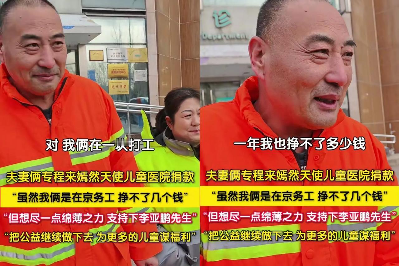 谁看了不心软!”一对外地在北京务工的夫妻俩,顶着寒风特意赶到嫣然儿童医院,捐完又急着往回赶! 路遇记者询问,丈夫质朴地说:“打工的,也想尽点力支持李亚鹏先生!” 他们平时忙,挣得不多,前一天看到相关消息,深受触动,特意请假赶来! 这夫妻俩,一脸朴实,说话都透着拘谨,却一口一个“李亚鹏先生”,满是敬重! 公益无贵贱,善意不分大小! 他们挣的是辛苦钱,却愿意拿出这份微薄之力,实在难得! 这样的善良,就像星星之火,温暖又能点燃更多爱心! 也希望这份善意能一直传下去,也希望嫣然医院让更多孩子能笑着抬起头! 大家说,这种质朴的善意是不是特让人感动?