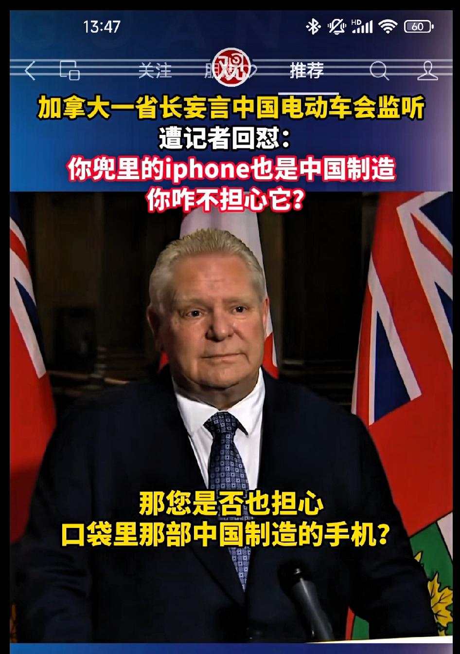 加拿大安大略省省长妄言:中国电动汽车会监听。记者回怼:你兜里的iPhone也是中国制造,你怎么不担心它? 记者:你有什么证据表明中国电车会监听安大略省居民或监听他们的电话? 安大略省省长:对国家安全构成最大“威胁”的是中国。我们知道当你接通电话时,他们会监听你,就是这么简单,任何不相信这一点的人都非常天真。 记者:按照你这种逻辑,你是否也担心口袋里那部中国制造的手机?你的iPhone也是在中国生产的。