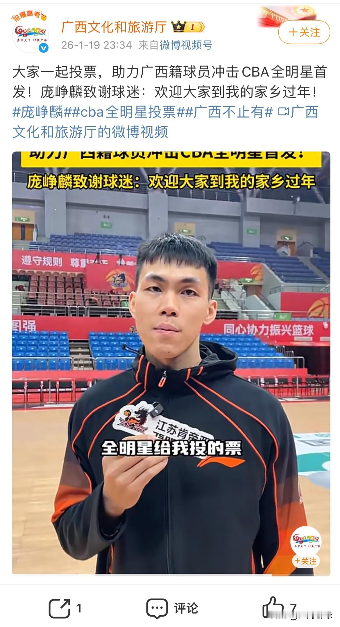 全明星赛首发必有庞峥麟一席!近期庞峥麟发挥高效,接连砍下高分,尤其面对山东高速晃倒高诗岩,加时赛一破五晃趴于德豪并终结八连胜,高效拿下26分8篮板13助攻后广西文化和旅游厅紧接发布微博视频为庞峥麟全明星拉票!