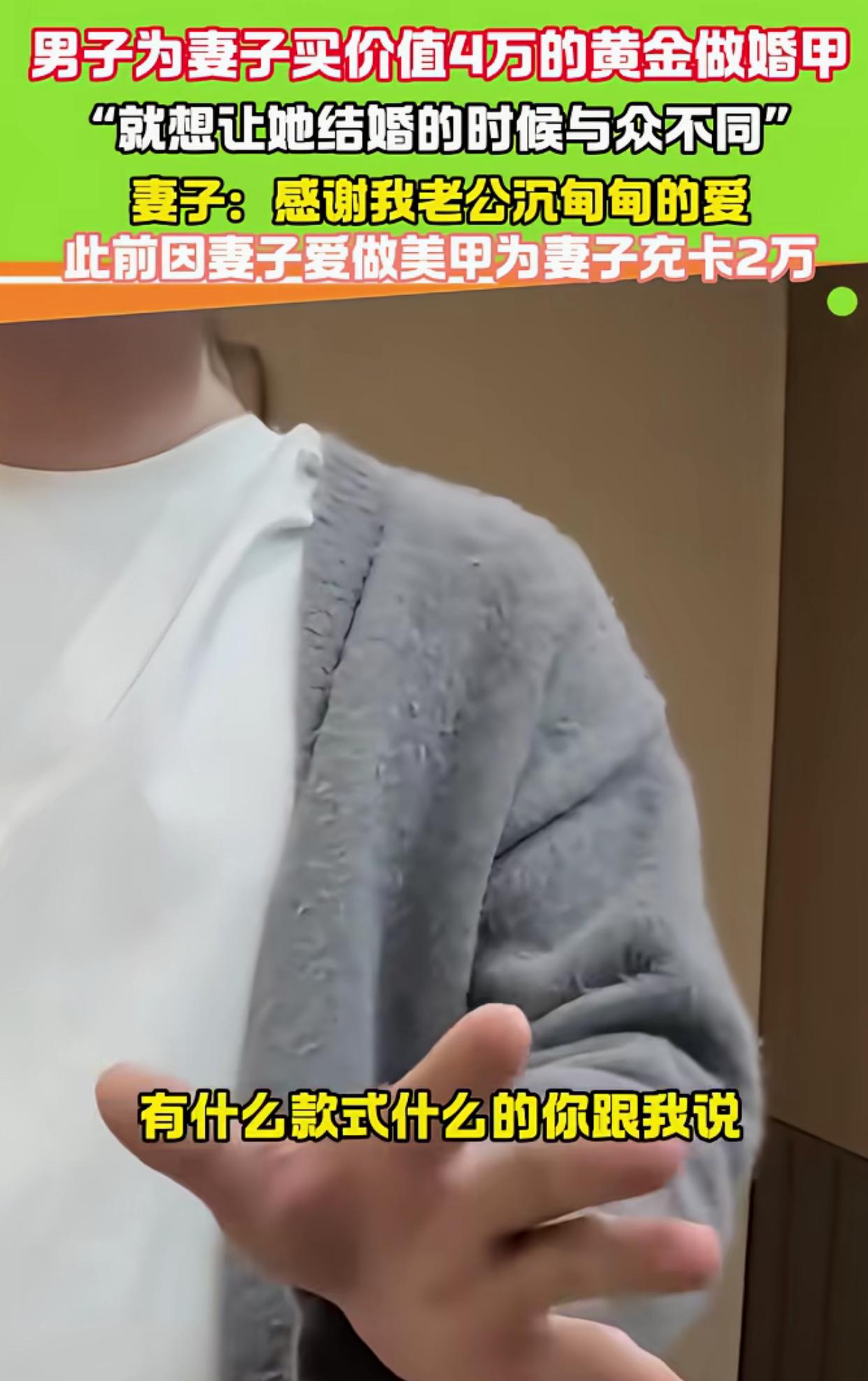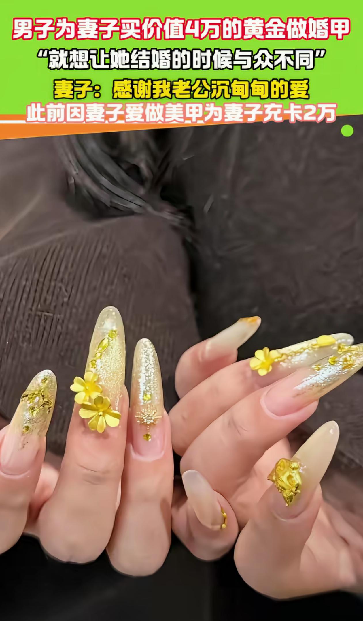 一女子非常喜欢做美甲,于是丈夫给她买40000块钱的黄金做婚甲,就想让妻子结婚的时候与众不同,不仅如此,这个丈夫还非常舍得给妻子花钱,此前还为妻子方便做美甲,充了20000块钱! 近日,一位女子的婚甲刷爆社交平台,不是因为款式有多精致,而是制作材料足够震撼——她的丈夫特意花4万元买了黄金,定制专属黄金婚甲,就为了让妻子在婚礼上脱颖而出,这份偏爱直接拉满。 女子从小就对美甲格外痴迷,日常只要有空就会去做美甲,指尖的精致程度早已成为生活标配。筹备婚礼时,她纠结了许久婚甲款式,既想独特吸睛,又不想落入俗套。 丈夫看在眼里记在心里,悄悄盘算着给她一个惊喜,干脆决定用黄金打造婚甲,既保值又足够特别。 为了做出满意的效果,丈夫特意挑选了纯度足够的黄金,带着妻子找到资深美甲师沟通设计方案。考虑到婚礼佩戴的舒适度和美观度,黄金并没有被做成厚重的甲片, 而是经过精细加工,碾压成薄如蝉翼的金箔,再切割成契合指甲的形状,搭配简约水钻和珍珠点缀,既显贵气又不浮夸。 整个定制过程耗时近一周,美甲师反复调试黄金金箔的厚度和贴合度,避免佩戴时脱落或刮伤衣物。 成品出炉时,女子看到指尖的黄金婚甲瞬间惊艳,阳光下金箔泛着柔和光泽,每一寸都透着用心,抬手间尽显高级感,完全满足了她对婚甲的所有期待。 而这还不是最宠的,早在筹备婚礼前,丈夫就得知妻子常为做美甲排队、充值优惠纠结,干脆直接在她常去的美甲店充了2万元会员卡。 他还特意叮嘱店家,只要是妻子喜欢的款式和项目,都可以直接从卡里扣款,不用让妻子再为费用纠结。这份细致入微的照顾,让女子满心欢喜,也让身边亲友纷纷羡慕,直言这才是嫁给爱情的样子,连做美甲都能被如此用心对待。 婚礼当天,女子穿着洁白婚纱,搭配专属黄金婚甲,成为全场焦点。敬酒时,不少亲友都忍不住夸赞她的婚甲独特又精致,得知是4万元黄金定制的,更是惊讶不已。女子指尖的黄金婚甲,不仅是装饰,更承载着丈夫满满的爱意,成为婚礼上最特别的纪念。 黄金婚甲的视频被分享到网上后,迅速引发热议。有网友调侃这是“最贵婚甲”,戴着都怕不小心刮花;也有网友羡慕女子被极致偏爱,直言这样的宠妻方式太让人酸了。 如今高端定制美甲越来越受欢迎,黄金、珍珠、宝石等贵重材料也常被用于美甲设计,但大多是点缀为主,像这样全金箔定制的婚甲并不多见。资深美甲师表示,黄金质地较软,做美甲时需特殊处理,且佩戴时要格外小心,避免磕碰变形。 这场充满爱意的黄金婚甲,不仅展现了丈夫的宠妻心意,也让大家看到了精致生活背后的用心。真正的偏爱,从不是轰轰烈烈的誓言,而是藏在这些细节里的迁就与满足,把对方的喜好放在心上,用行动给予最好的呵护。 爱情里的仪式感,从来都不分贵贱,却因这份专属与用心而格外动人。指尖的黄金婚甲会褪色变形,但这份沉甸甸的爱意,却能温暖漫长岁月。 对此,你们有什么看法,欢迎评论留言~