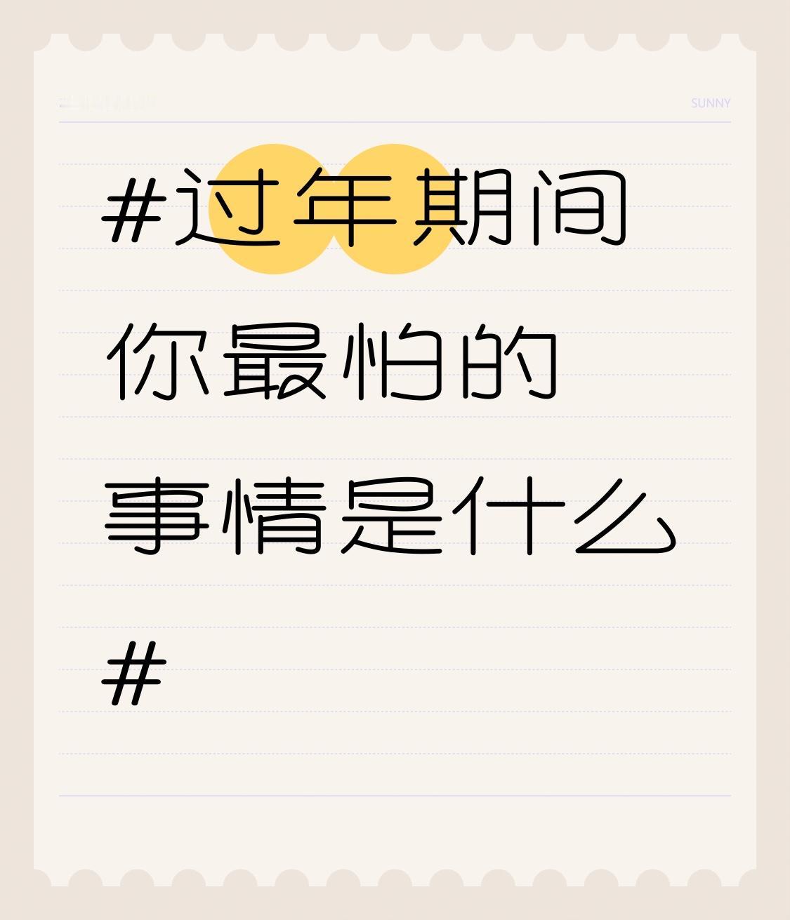 过年期间你最怕的事情是什么 过年本是团圆喜乐时,可我最怕的事还真不少。 首当其冲是“被灵魂拷问”。未婚被催婚,已婚被催生,工作了被问收入,学生被问成绩,亲戚的“关心”就像紧箍咒,让人头疼。 “被迫营业”的社交也让我疲惫不堪。走亲访友、同学聚会,一个接一个,遇到多年未见还得假装亲密的人,实在心累。 还有“钱包大出血”,红包、年货、礼品,开销像无底洞。给晚辈红包要比面子,给长辈礼物要显心意,一不小心钱包就瘪了。 最后是“被道德绑架”的亲情矛盾,七大姑八大姨打着“为你好”的旗号指手画脚,让人无奈。唉,这年过得真是压力山大!
