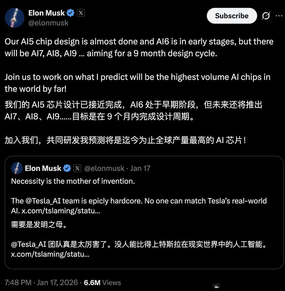 马斯克披露五代AI芯片路线图,AI5芯片设计已接近完成,AI6处于早期阶段,未来还将推出AI7、AI8、AI9……,目标是将设计周期缩短至9个月。他预测这将是迄今全球产量最高的AI芯片。根据去年报道,AI5芯片将采用三星2nm和台积电3nm制程工艺,预计将支持特斯拉的全自动驾驶及其他AI驱动的项目,包括Optimus人形机器人系统。特斯拉预计AI5的总体性能是AI4的50倍,内存容量是AI4的9倍。而AI5预计在2027年量产,AI6预计将于2028年推出。特斯拉马斯克